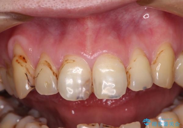 前歯は着色や虫歯治療の跡が目立っている状態で、オールセラミッククラウンによる審美治療を希望されていました。