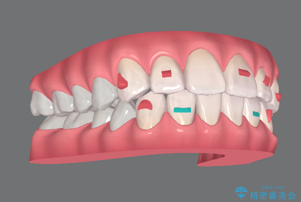 短期間で成果を出すために、奥歯は噛み合わせを変えないような設定で前歯のみの矯正治療を行っています。