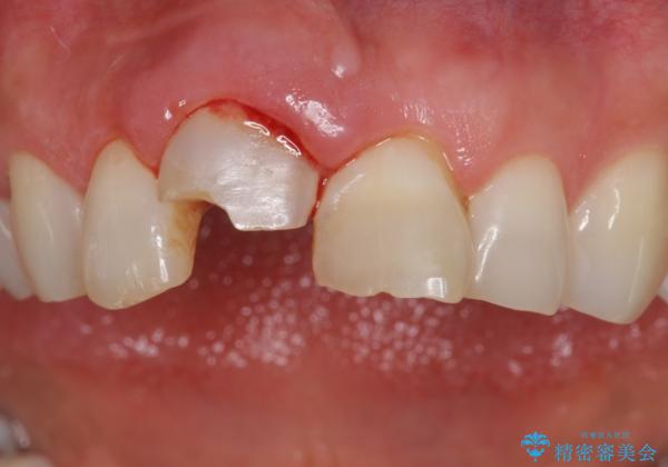 検査の結果、歯は大きく折れておらず、骨の中に埋め込まれていた状態であったため、部分矯正で歯を引っ張り出していきます。