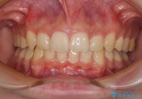下顎骨の左右差や、上顎骨の前方位などが認められたため、上下左右の第1小臼歯4本を抜歯し、ワイヤー装置にて矯正治療を行うこととしました。