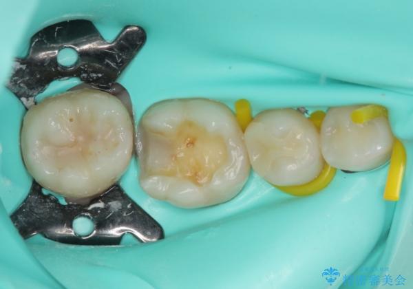 レントゲン写真などから、速やかに処置を行うべき歯が2歯あったため、それぞれセラミックインレーとPGAインレー(ゴールドインレー)にて修復治療を行うこととしました。