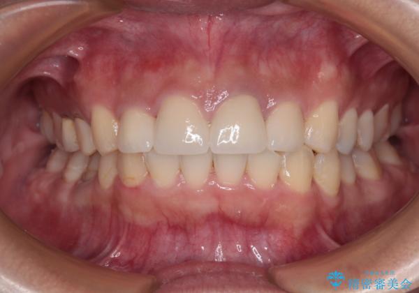 歯列以外に、上顎左右側切歯が矮小歯であり、上顎4前歯は失活していたため、矯正治療で歯列を整えるとともに上顎前歯の幅を調整し、矯正治療後にオールセラミッククラウンにて審美歯科治療を行うこととしました。