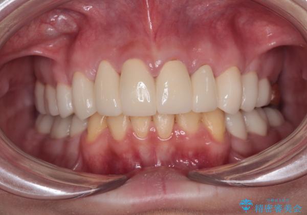 途中来院が困難な時期があったり、歯周外科処置を行って治癒を待ったりと、治療期間は長くなりましたが、初診時とは比べものにならないくらいきれいに仕上げることができました。