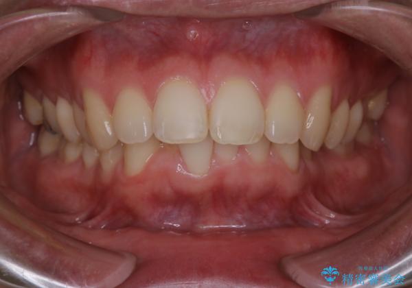 もともとの歯の根っこの位置の関係で、治療途中において上下の真ん中の位置がずれてしまいました。機能的には問題ありませんが患者様と相談し、期間を延ばした上で真ん中を合わせる治療を追加で行いました。
