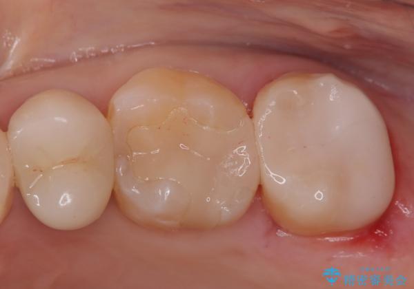 金属のインレーの下と、歯と歯の間も虫歯だったため、つなげた形でセラミックインレーにて修復を行なっています。