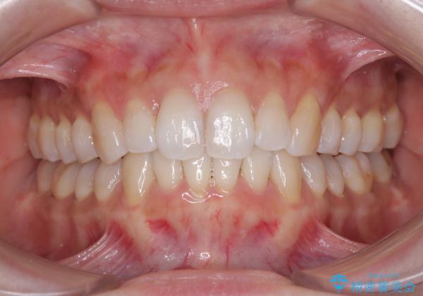 歯列としてはインビザラインでもワイヤー矯正でも対応できるものでしたが、奥歯の咬み合わせを見た時に上顎がやや前方にあり、インビザライン単独では時間のかかってしまう可能性があるため、補助装置を治療当初に使用することで、インビザラインによる治療をスムーズに行えるように計画しました。