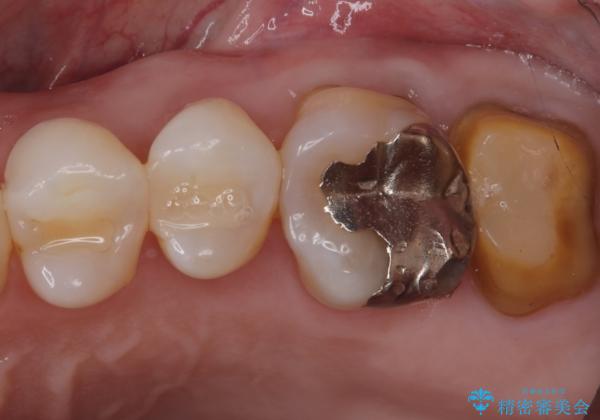 保険適応のメタルインレーと歯質との間に不適合な箇所を認め、補綴物のやり替えでの治療となりました。インレーからクラウンへ補綴物の形態を変更し、素材は清掃性・適合性・審美性の点からセラミッククラウンでのやり替となりました。