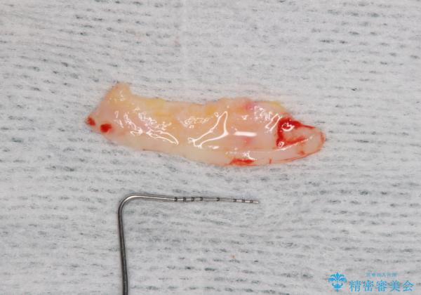 歯肉が非常に薄く、歯肉退縮を起こしていたため、口蓋(上顎の内側)から採取した結合組織(歯肉の内側の組織)を移植することによる、根面被覆術を行うこととしました。