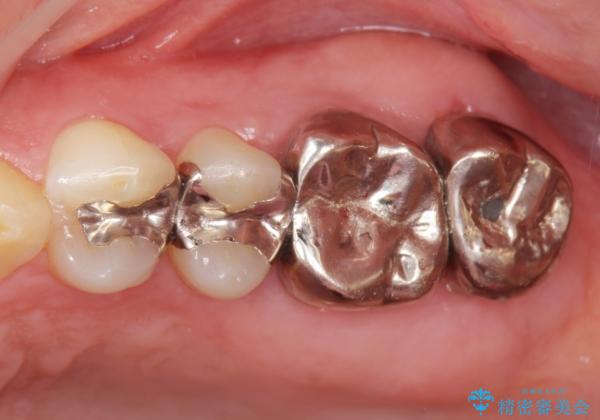 - 銀歯をやりかえたいが他院で抜歯と言われセカンドオピニオンで来院。適合の悪い被せ物が入っており、まずは古い材料、虫歯をとり保存可能か確かめる必要があり、拡大鏡下で全て取り除いたら歯質が歯茎の中まで虫歯がありました。このまま無理やり型取りをして被せ物を作っても不適合な被せ物が入る可能性が高いため歯茎を切り取る手術(ディスタルウェッジ)を行いました。そして再根管治療を行いゴールドの被せ物で治療を行いました。
