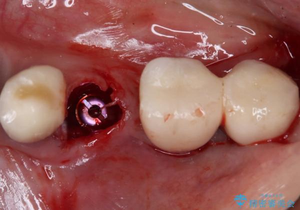 そのため、当院に新しく導入した手法により、抜歯をした日にインプラントを埋入し、そのままを仮歯を装着することで、他の歯への負担を軽減する計画を立てました。