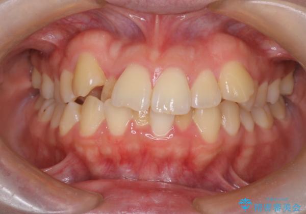 - 患者様は、結婚式までに歯並びを整えたいとのご要望で来院されました。診断の結果、上下左右の第一小臼歯を抜歯し、歯列全体を整える計画としました。審美性を重視し、目立ちにくいホワイトワイヤーを使用した矯正を提案しました。治療期間は2年を目安とし、結婚式までに前歯の整列と噛み合わせを優先的に整えるスケジュールで進めました。定期的な調整と経過観察を通じて、計画的に治療を進めました。