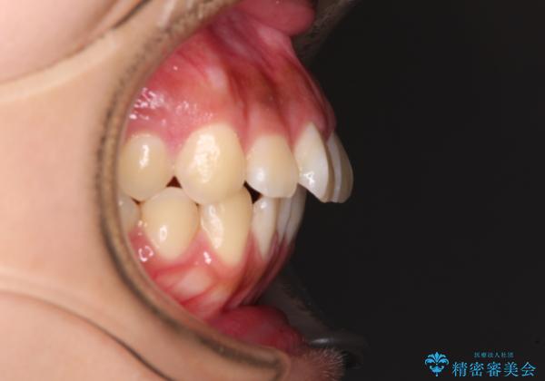 目立たない装置を希望とのことで、上顎が裏側、下顎が表側のハーフリンガル装置を用いることとしました。