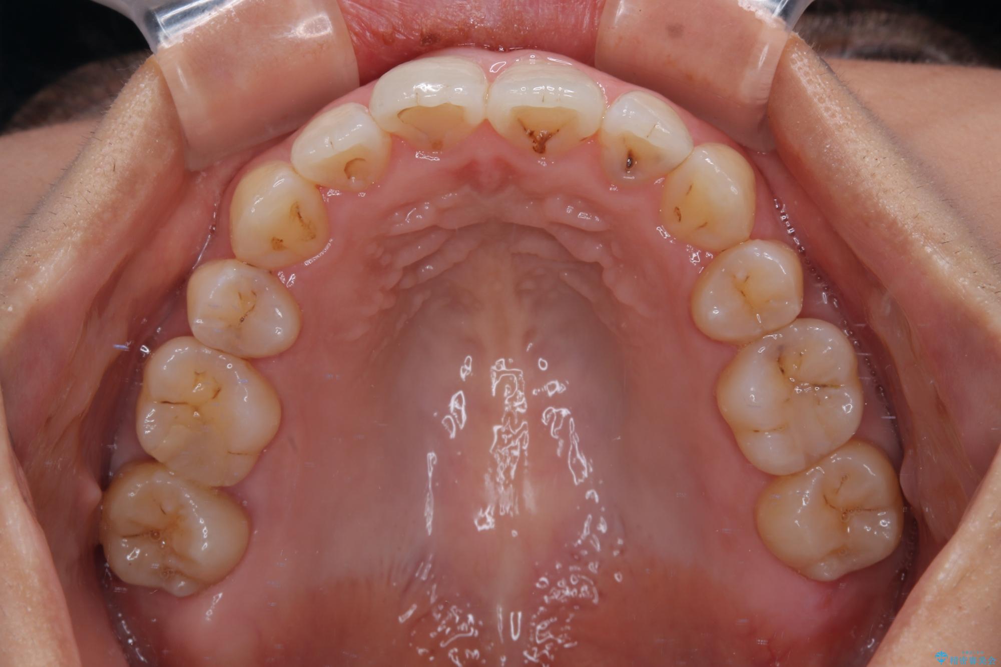 上下顎ともに歯列全体の後方移動とIPR(歯と歯の間を削る)によってデコボコが解消するように設計し、インビザラインにより治療を行うこととしました。