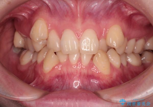 上下ともに八重歯が顕著であり、前歯のクロスバイトがあったため、上下左右の第一小臼歯4本を抜歯し、ワイヤー装置での抜歯矯正を行うこととしました。