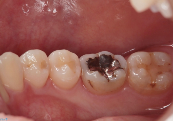 - 他院で治療した後にでき、当院で経過観察していた虫歯をセラミック修復にて治療させていただいた患者様です。当院では定期的にレントゲン写真を撮影しており、小さな虫歯が大きくならないように口腔衛生指導を行っております。もし虫歯が大きくなってきてしまった場合、症状が出る前にこのように治療をすることが可能です。術後も経過良好です。