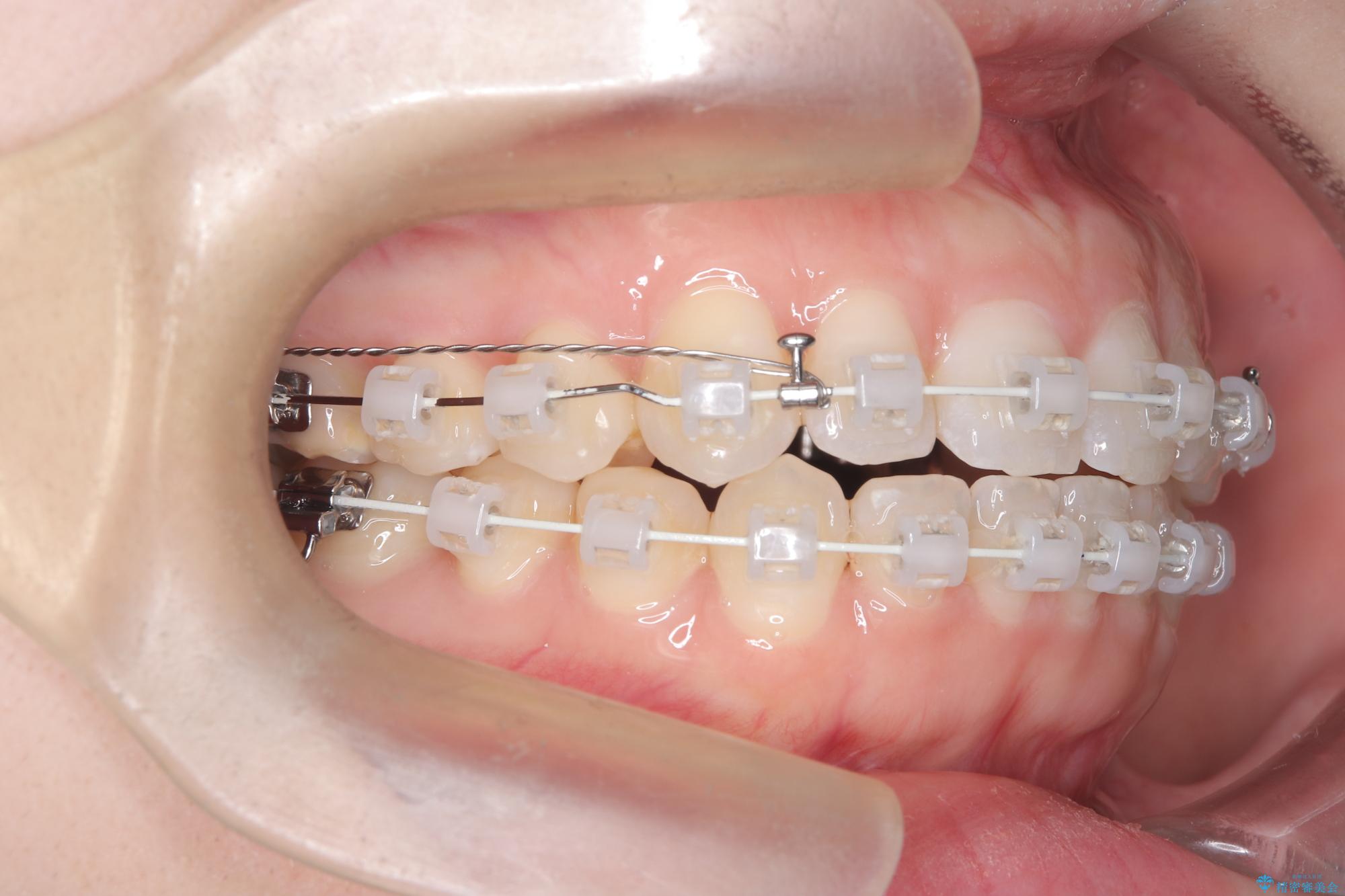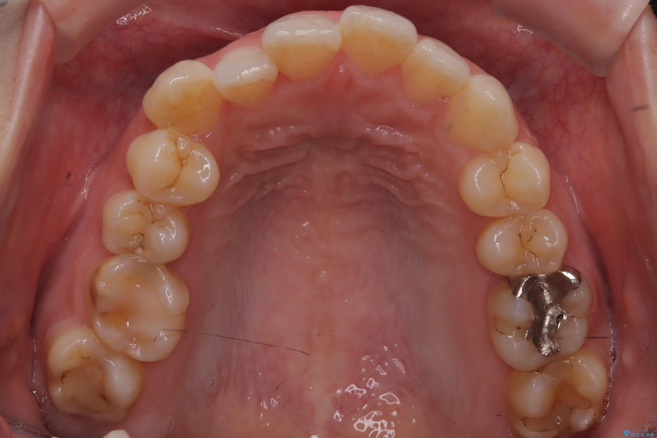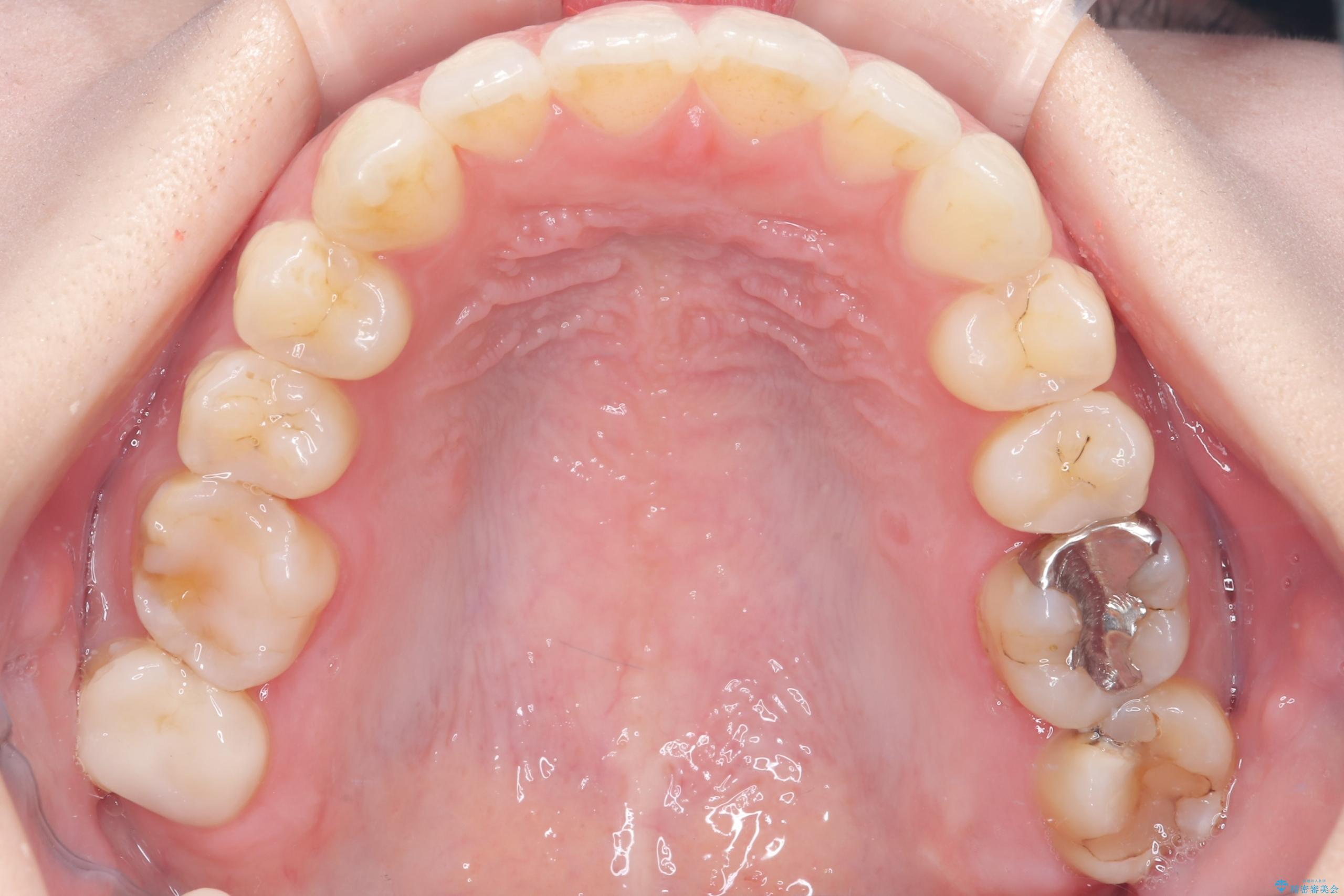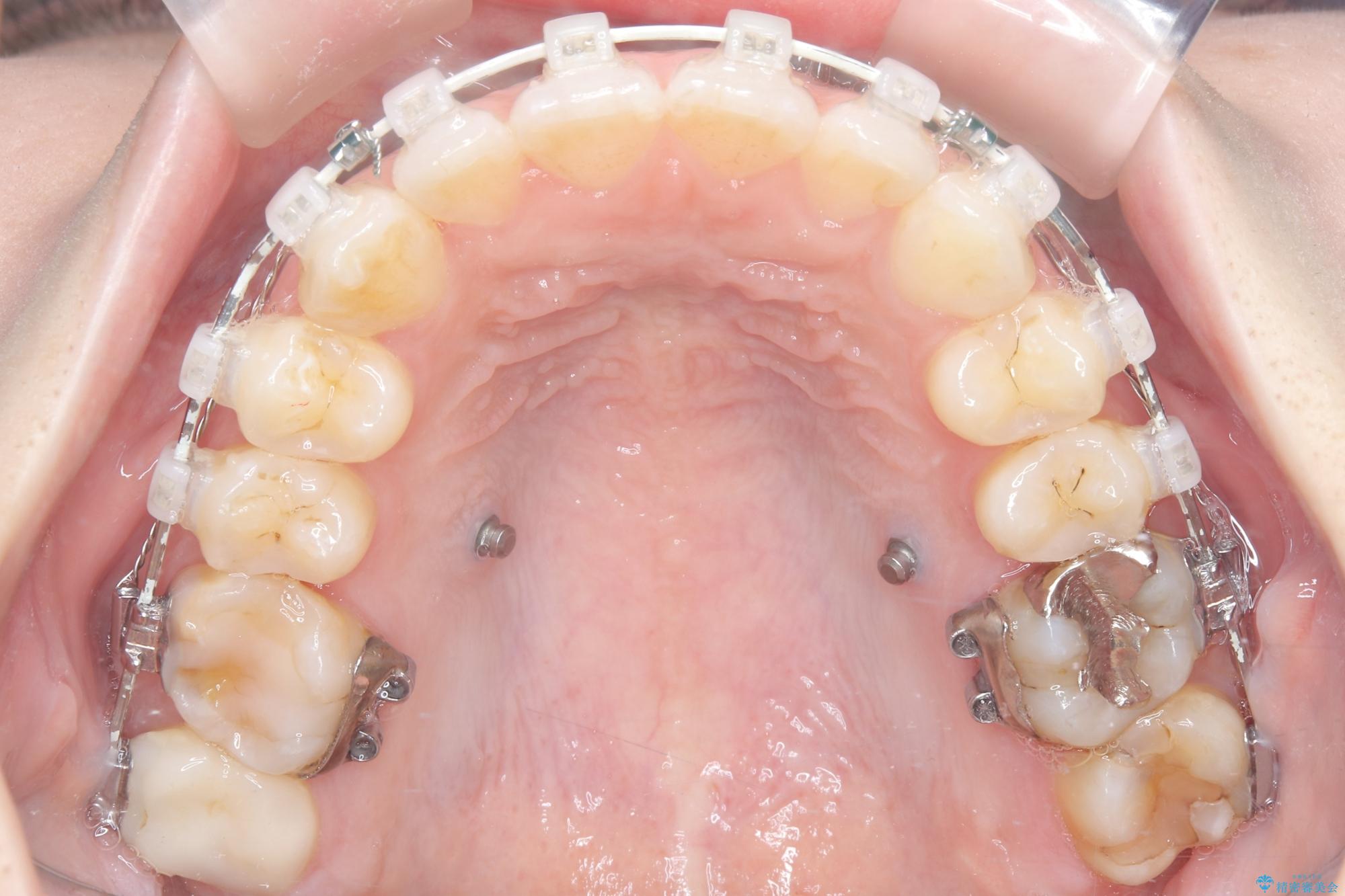 今回のワイヤー矯正治療では、抜歯せずに歯を並べるスペースを作るため、特殊な小さなインプラントであるアンカースクリュー(TAD)を一時的に使用しました。このアンカースクリューを固定源として、奥歯(臼歯部)全体を後方へ遠心移動させました。従来の矯正では難しかったこの奥歯の移動を確実に行うことで、前歯の八重歯を適切な位置に並べるスペースを確保。治療の結果、抜歯することなく右上の八重歯と叢生が解消され、機能的にも審美的にも整った美しい歯並びを獲得していただけました。