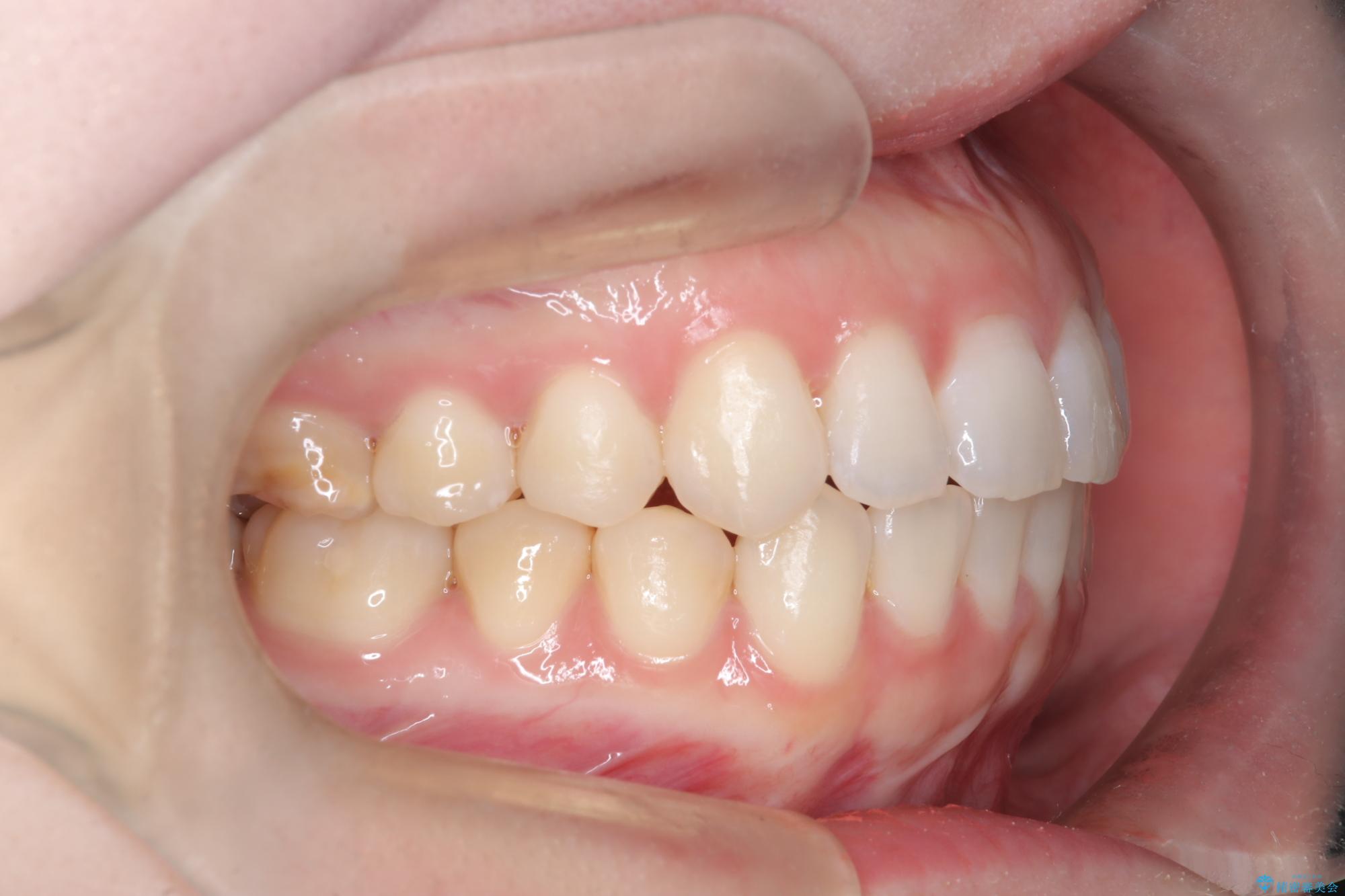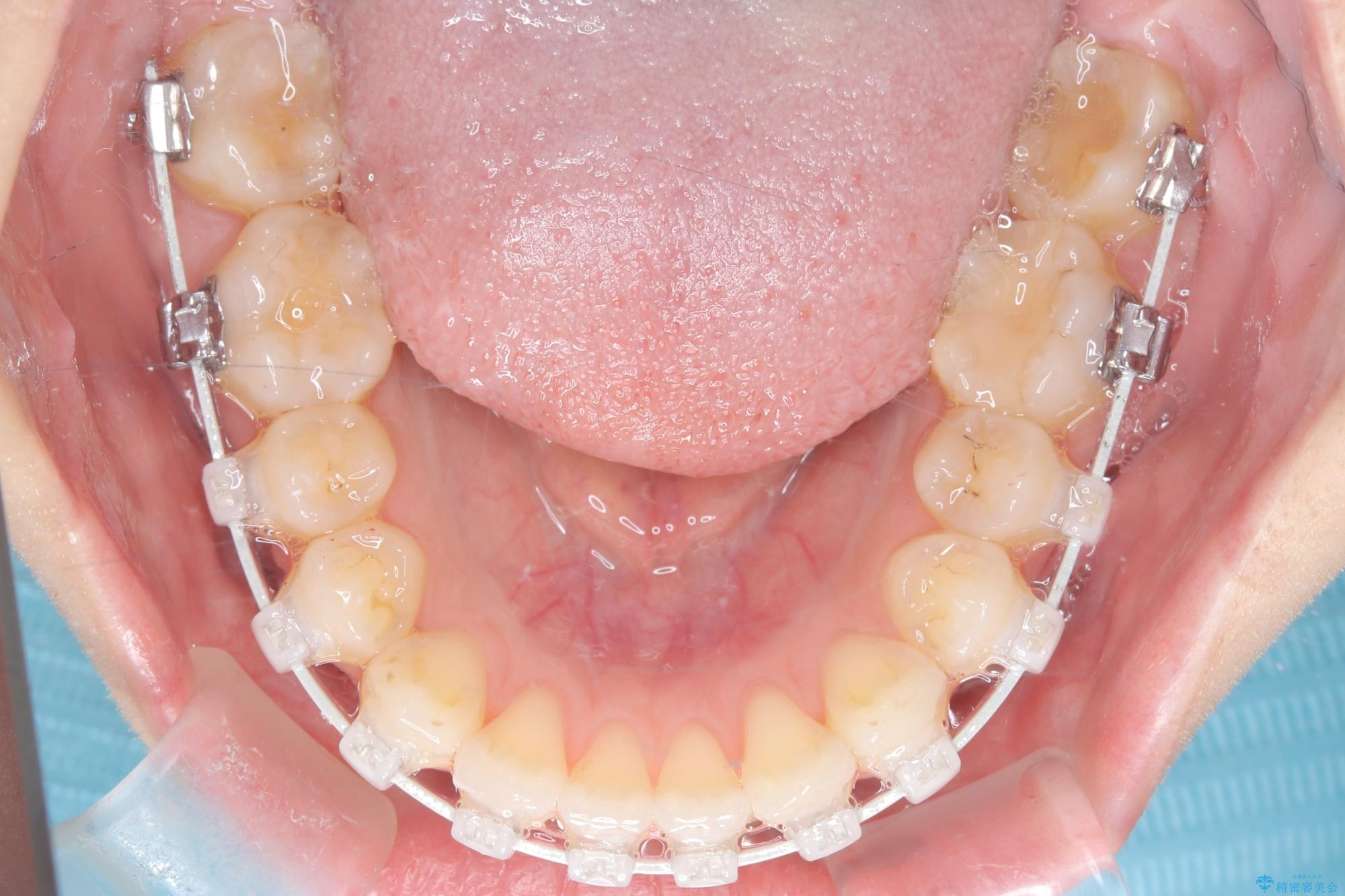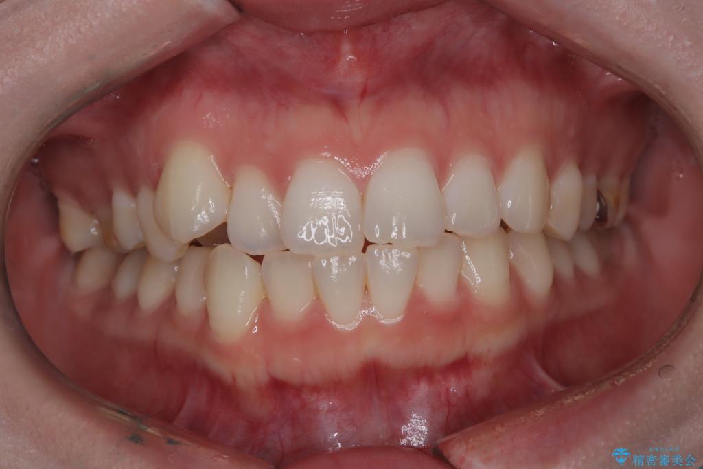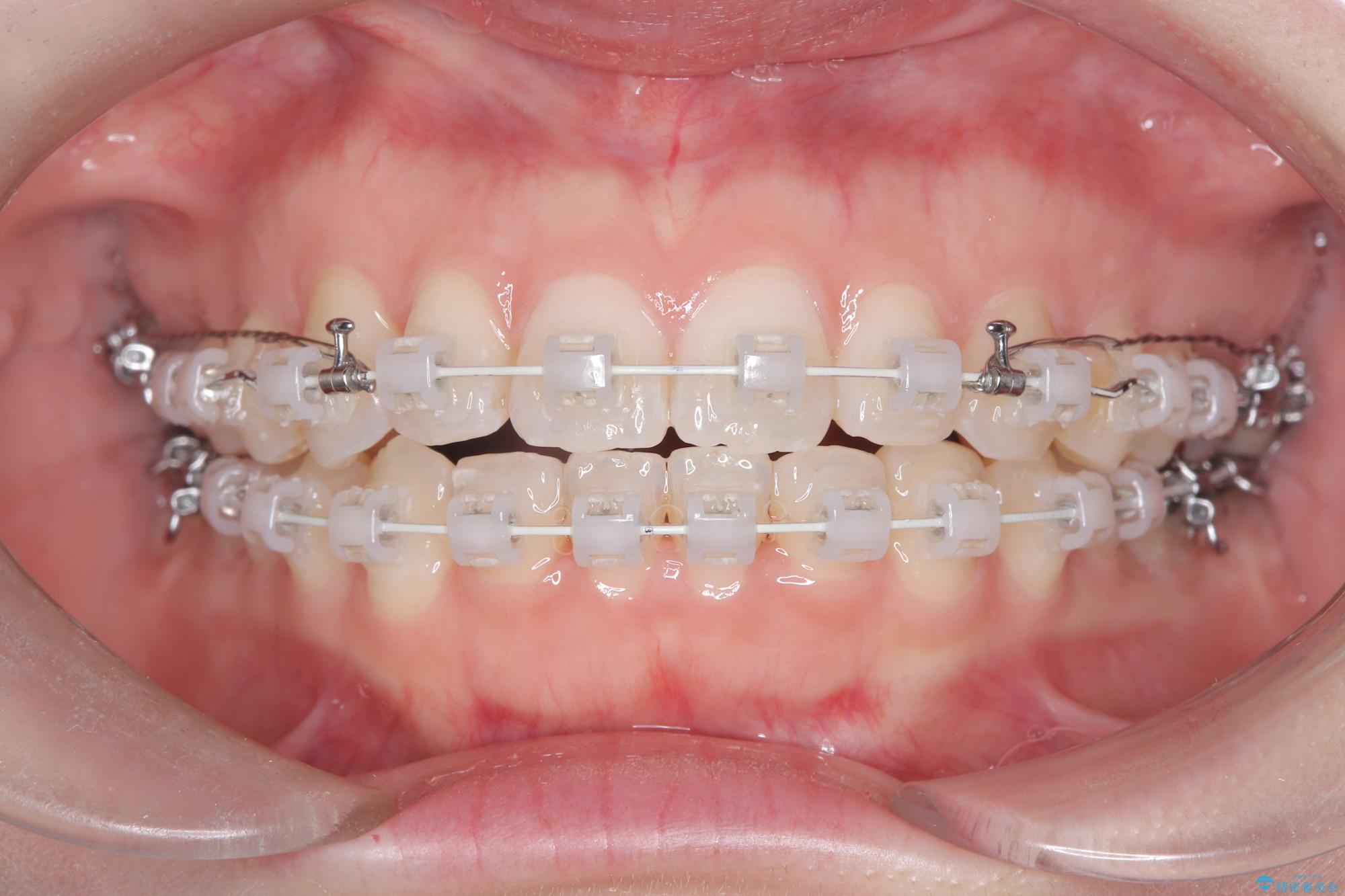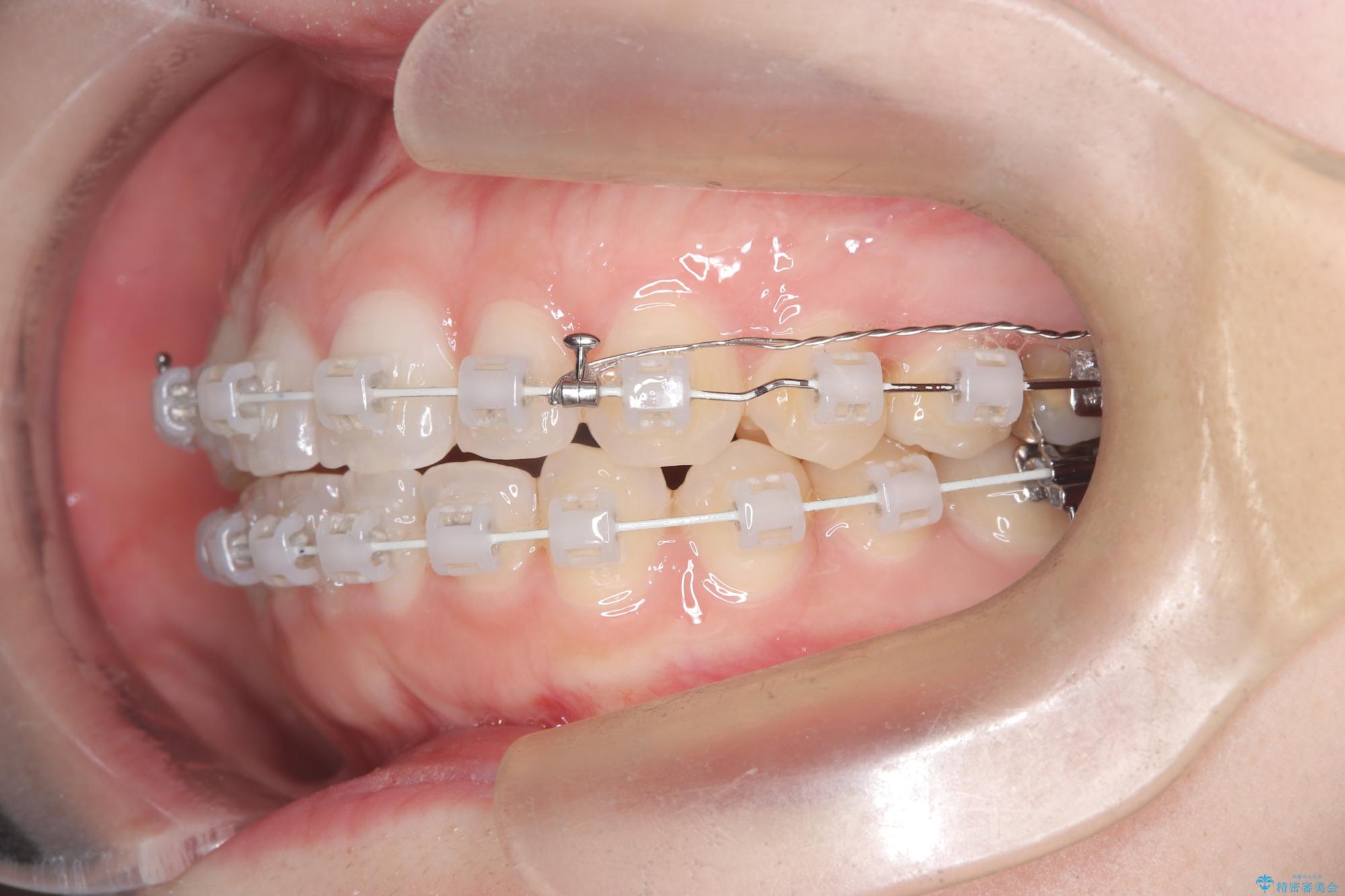 今回のワイヤー矯正治療では、抜歯せずに歯を並べるスペースを作るため、特殊な小さなインプラントであるアンカースクリュー(TAD)を一時的に使用しました。このアンカースクリューを固定源として、奥歯(臼歯部)全体を後方へ遠心移動させました。従来の矯正では難しかったこの奥歯の移動を確実に行うことで、前歯の八重歯を適切な位置に並べるスペースを確保。治療の結果、抜歯することなく右上の八重歯と叢生が解消され、機能的にも審美的にも整った美しい歯並びを獲得していただけました。