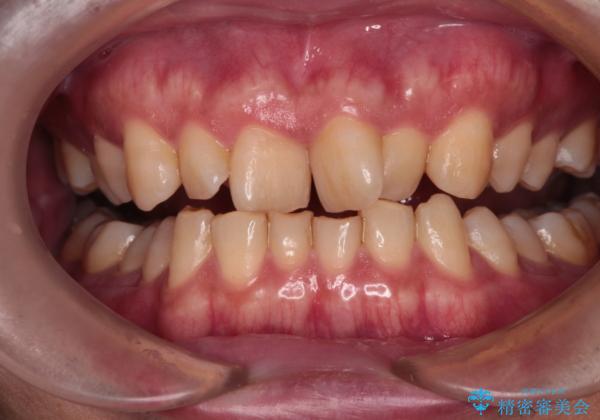 骨格的に上顎骨がやや前方にあり、それが原因で下顎前歯が隠れるほどのディープバイトになっている状態でした。