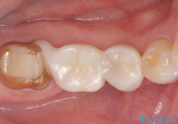 対合歯との咬合関係において、右下7番目と6番目の被せものの連結部がたわみやすい環境にあったため、ブリッジの新製ではなくインプラント治療を行いすべての歯を単冠仕上げとすることにしました。