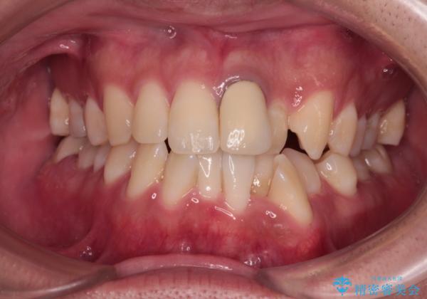 上下ともに歯列幅が狭く、その影響でデコボコになっていたため、ワイヤー装置を用いて歯列を側方に拡大しながら、デコボコを解消していくこととしました。