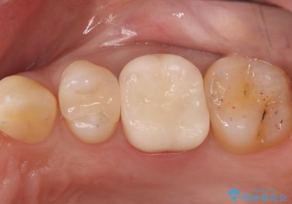 治療では、まず虫歯に侵された歯質を丁寧に除去し、セラミッククラウンを装着するための歯の形成を行いました。型取りから患者様の歯の形や色に合わせたオーダーメイドのセラミッククラウンを作製。セラミックは、隣接する歯との隙間なく精密に適合し、プラークが付着しにくいため、虫歯の再発を防ぐ効果があります。最終的に、精度の高いクラウンを装着し、咬み合わせを細かく調整しました。これにより、虫歯の再発を防ぎ、快適に食事ができる奥歯を取り戻していただけました。