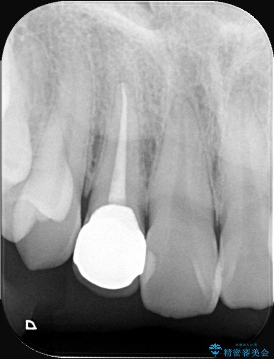 初診時に歯髄診断を行い、不可逆性歯髄炎と診断し抜髄から補綴修復までの流れを説明し、精密根管治療、ファイバ-コア築造、オールセラミッククラウン(St)修復を行うこととしました。