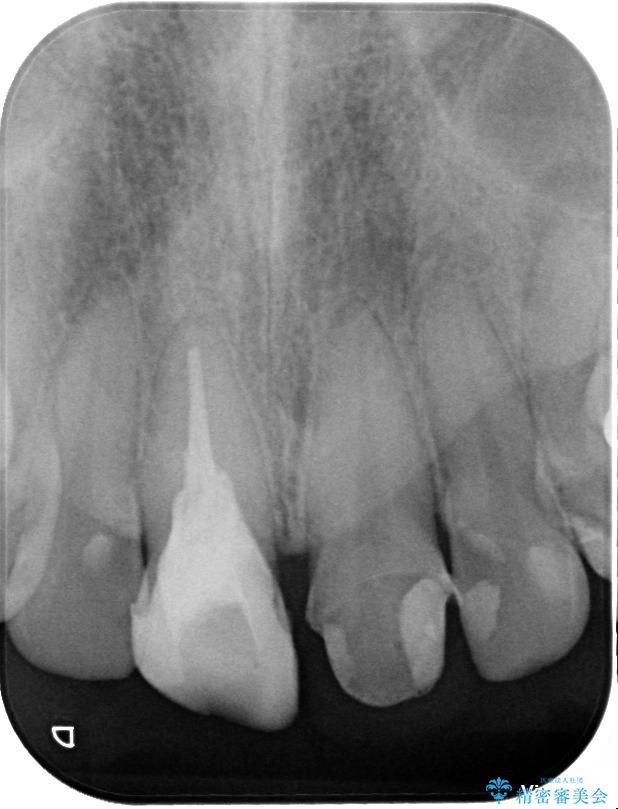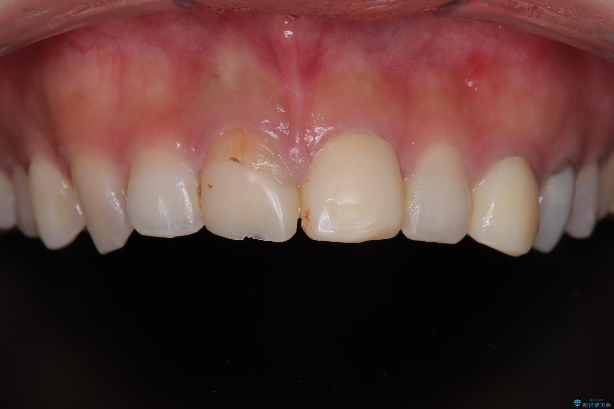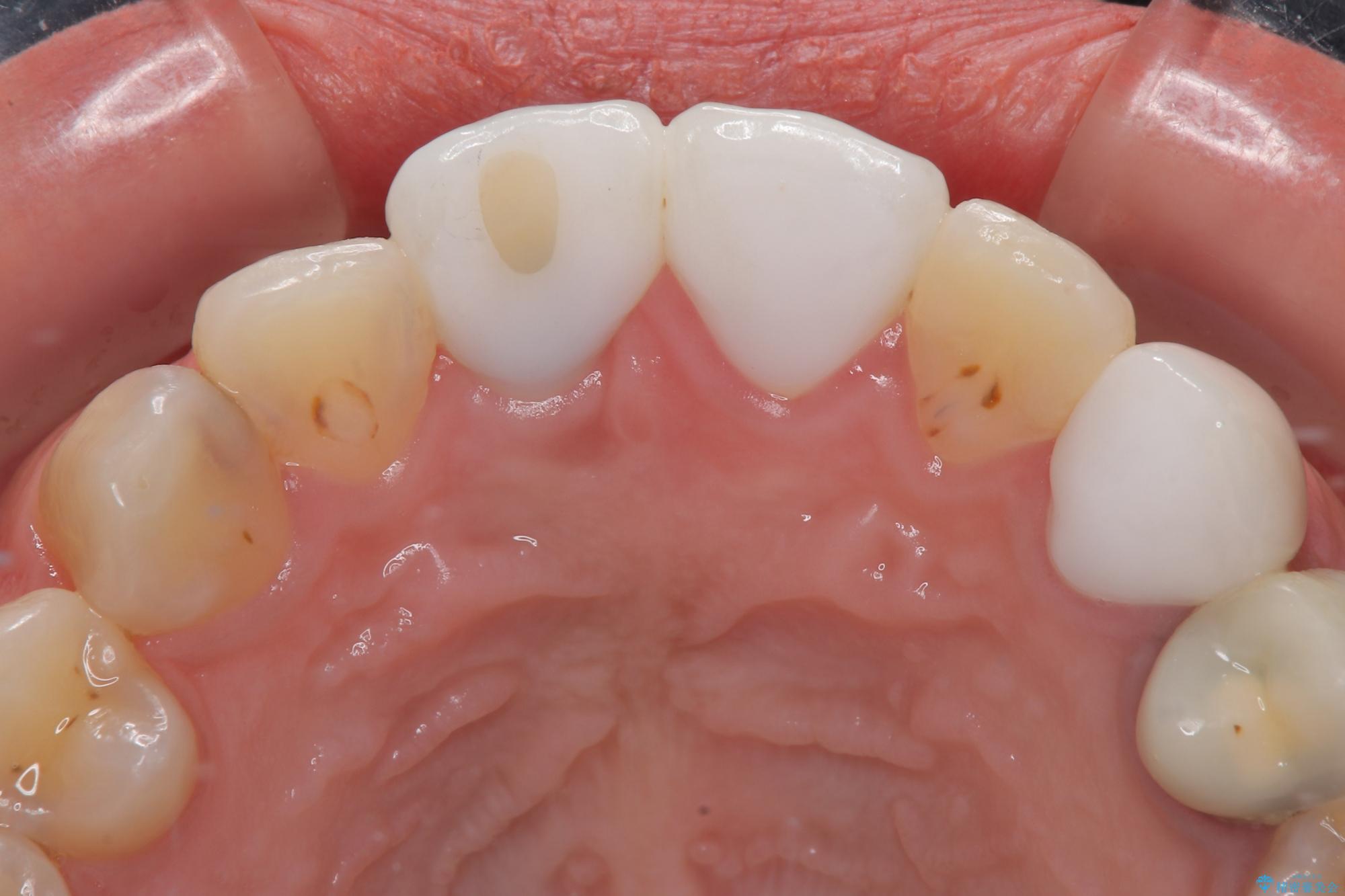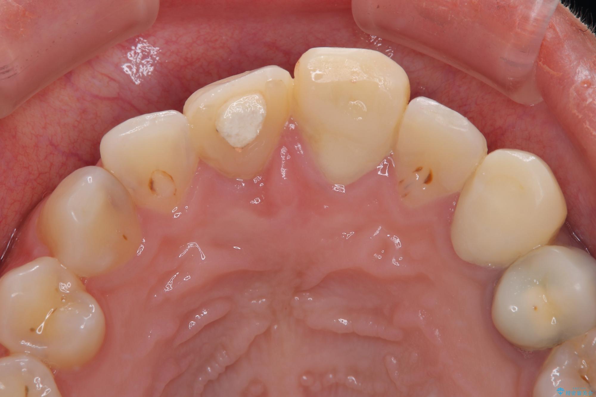 他院にて「上の前歯(右上中切歯)は抜歯してインプラントかブリッジにする必要がある」と診断され、大変ショックを受けられていました。