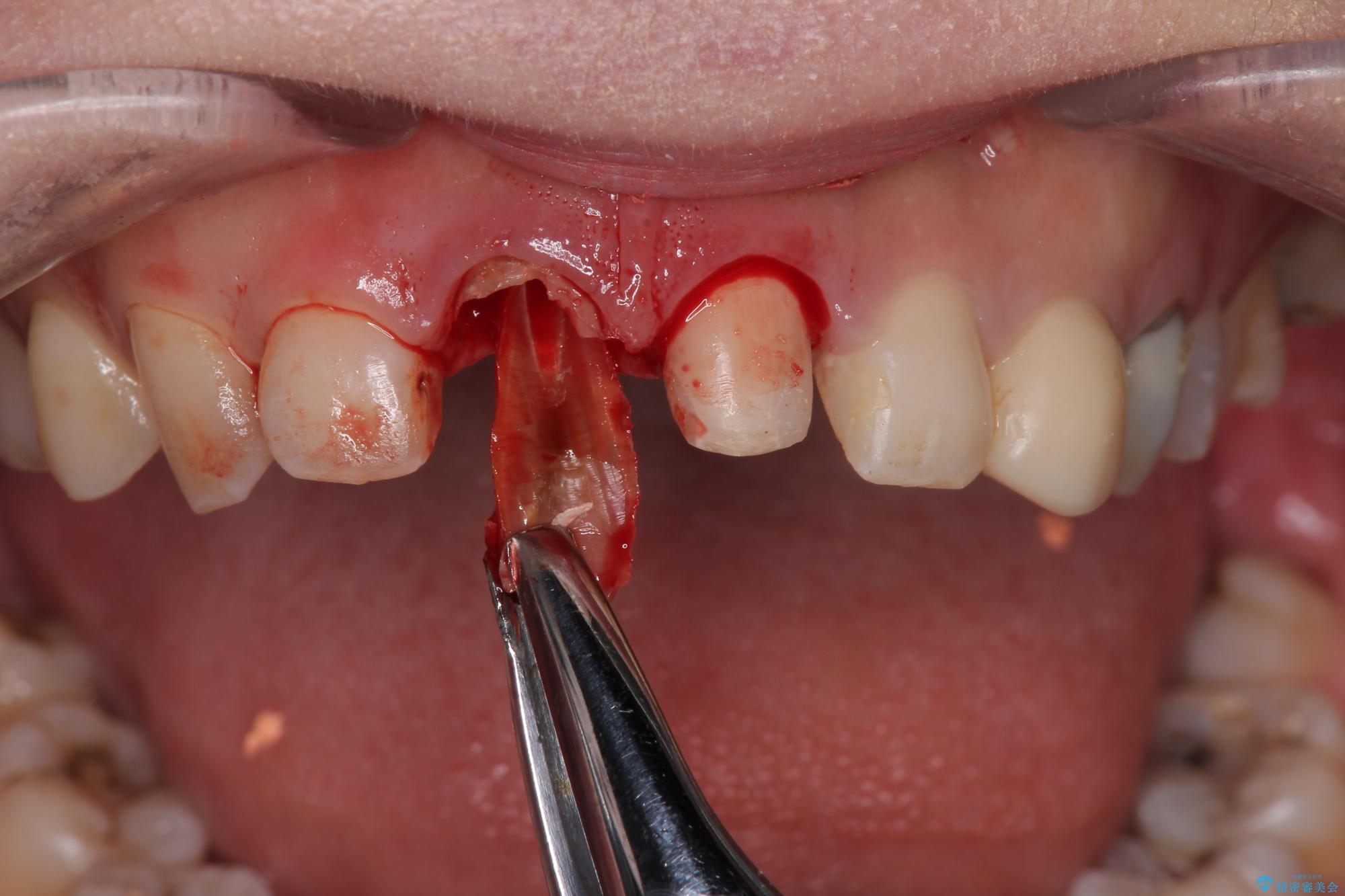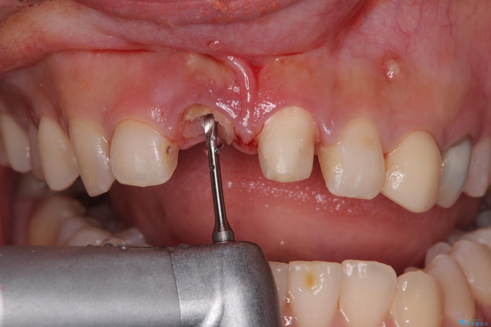 ■保存治療の選択肢として**挺出(エクストリュージョン)**により歯を引っ張り出し、フェルールを確保する方法も検討可能でしたが、患者様のご希望により、より短期間で審美性を回復できる治療法を選択。