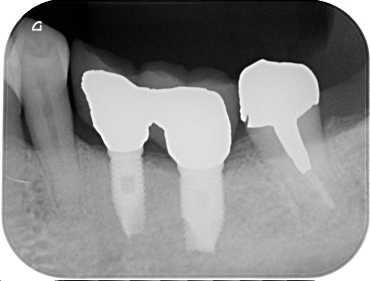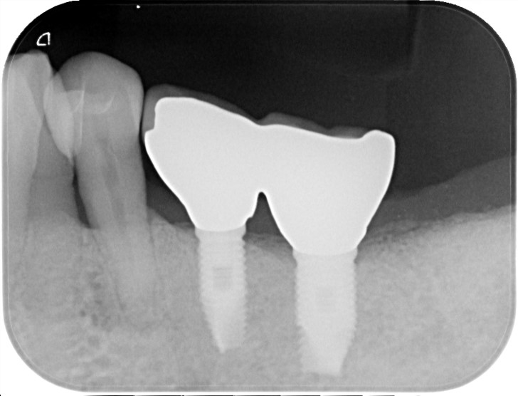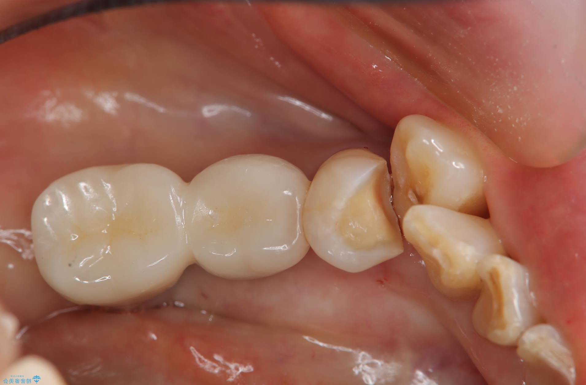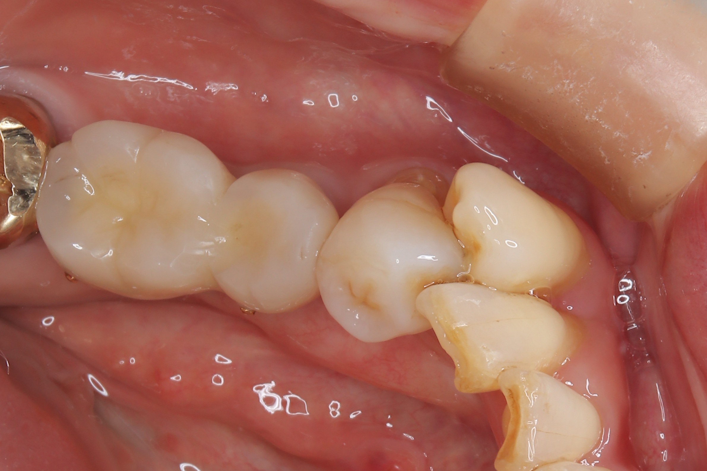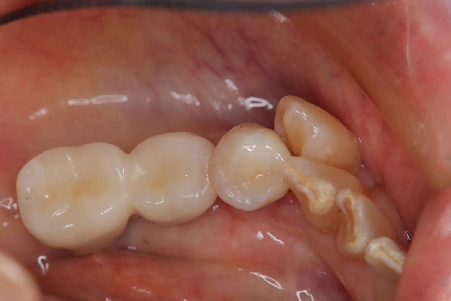 - 左下のがたつきが大きい歯(乱ぐい歯)の部分に虫歯が見つかった患者様です。通常、こういった部位の虫歯治療のレジン充填は正確な形態を作るのが難しいとされているため、今回はシリコンにて型どりを行い、そのうえでセラミックインレーにて治療いたしました。術後にフロスがしっかりと通せるように、ラバーダム防湿を行っています。