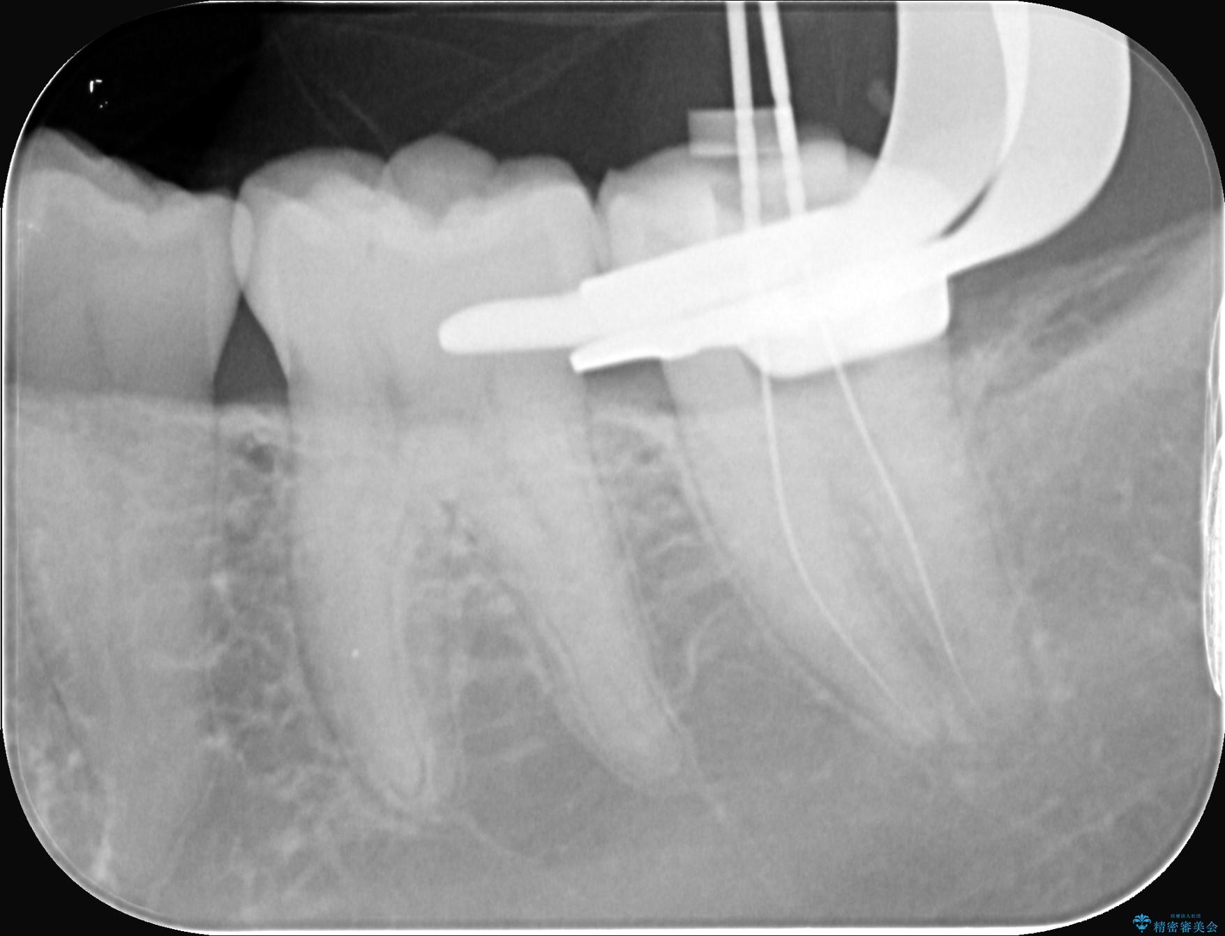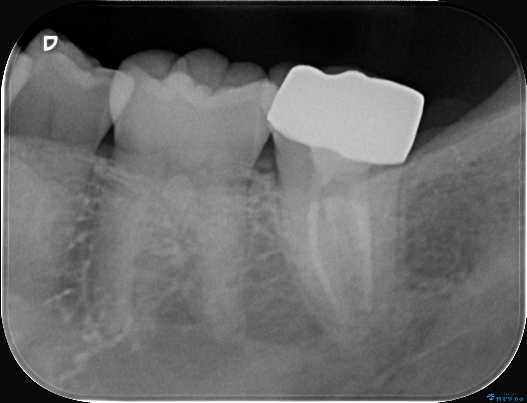 - 昨日からのズキズキとした激しい痛みを主訴にご来院されました。レントゲンおよび歯髄診察の結果、不可逆性の歯髄炎(歯の神経の重度の炎症)と診断。歯を残すことを第一に、まず痛みの原因である神経を取り除く根管治療を提案しました。また、虫歯が歯肉の下まで深く進行していたため、根管治療後に歯周外科処置を行い、最終的に精密なセラミッククラウンで修復する、総合的な治療計画を立案しました。