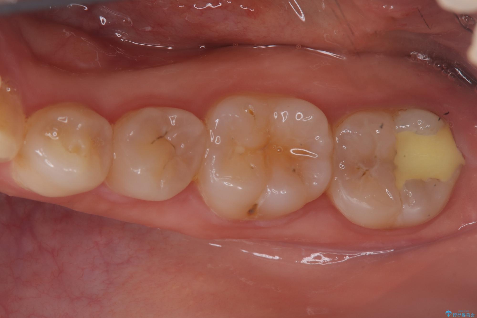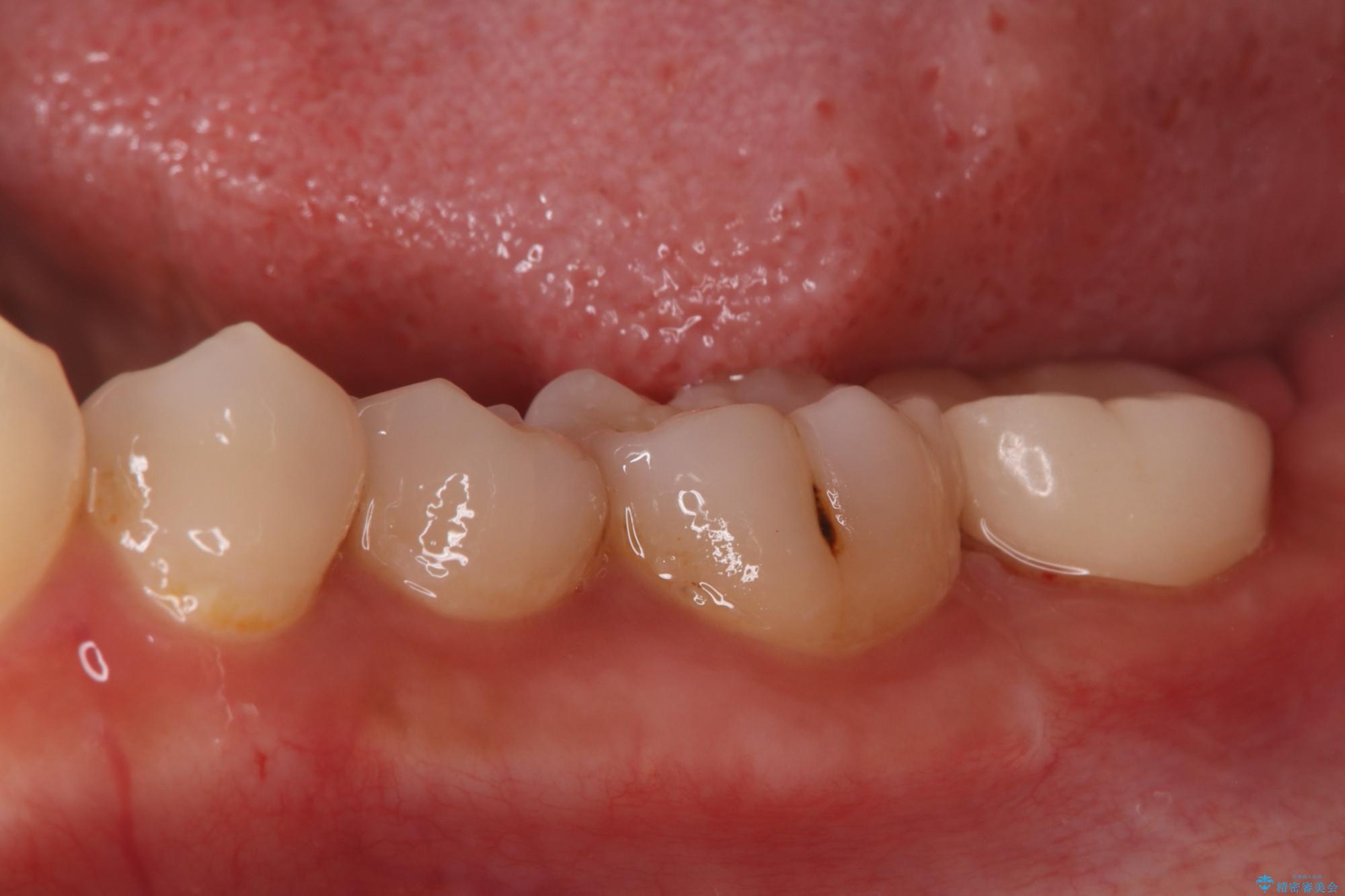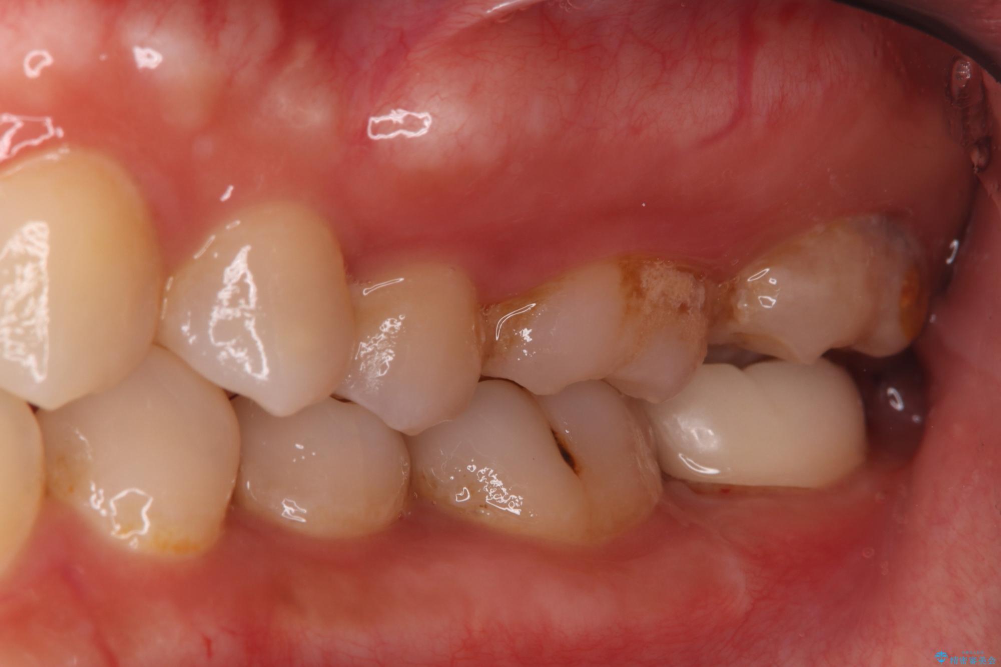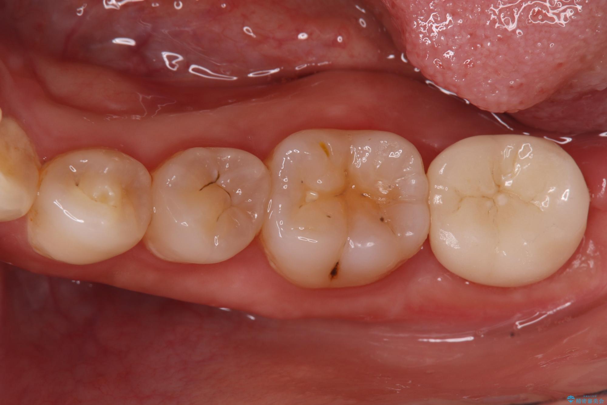 治療はまず、根管治療から始め、感染した神経を徹底的に除去することで、痛みをすぐに解消しました。再発を防ぐため、ラバーダムや顕微鏡を使って、根管内を丁寧に、そして精密に処置しました。次に、深い部分の虫歯を確実に治療するため、歯周外科処置を行い、治療しやすい環境を整えました。最後に、機能と見た目に優れたセラミッククラウンを作製・装着。根管治療から外科処置、審美修復までを一貫して行うことで、再発リスクの低い、長期的に安定して使える奥歯を取り戻していただけました。