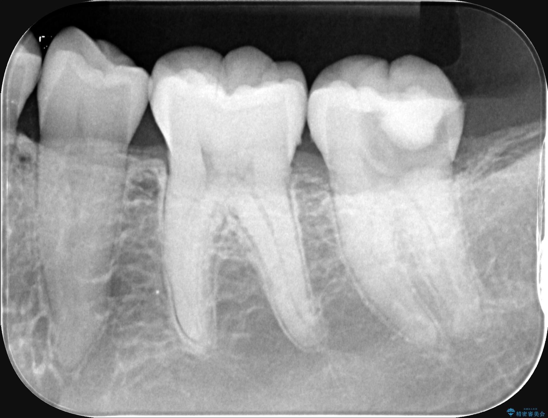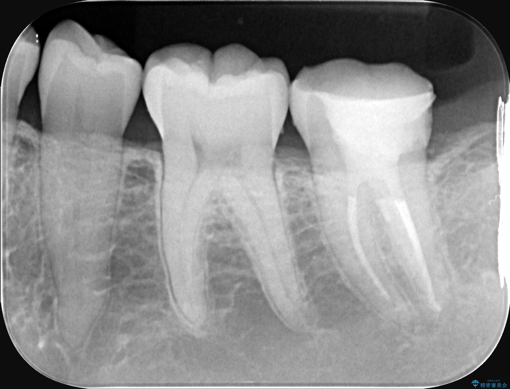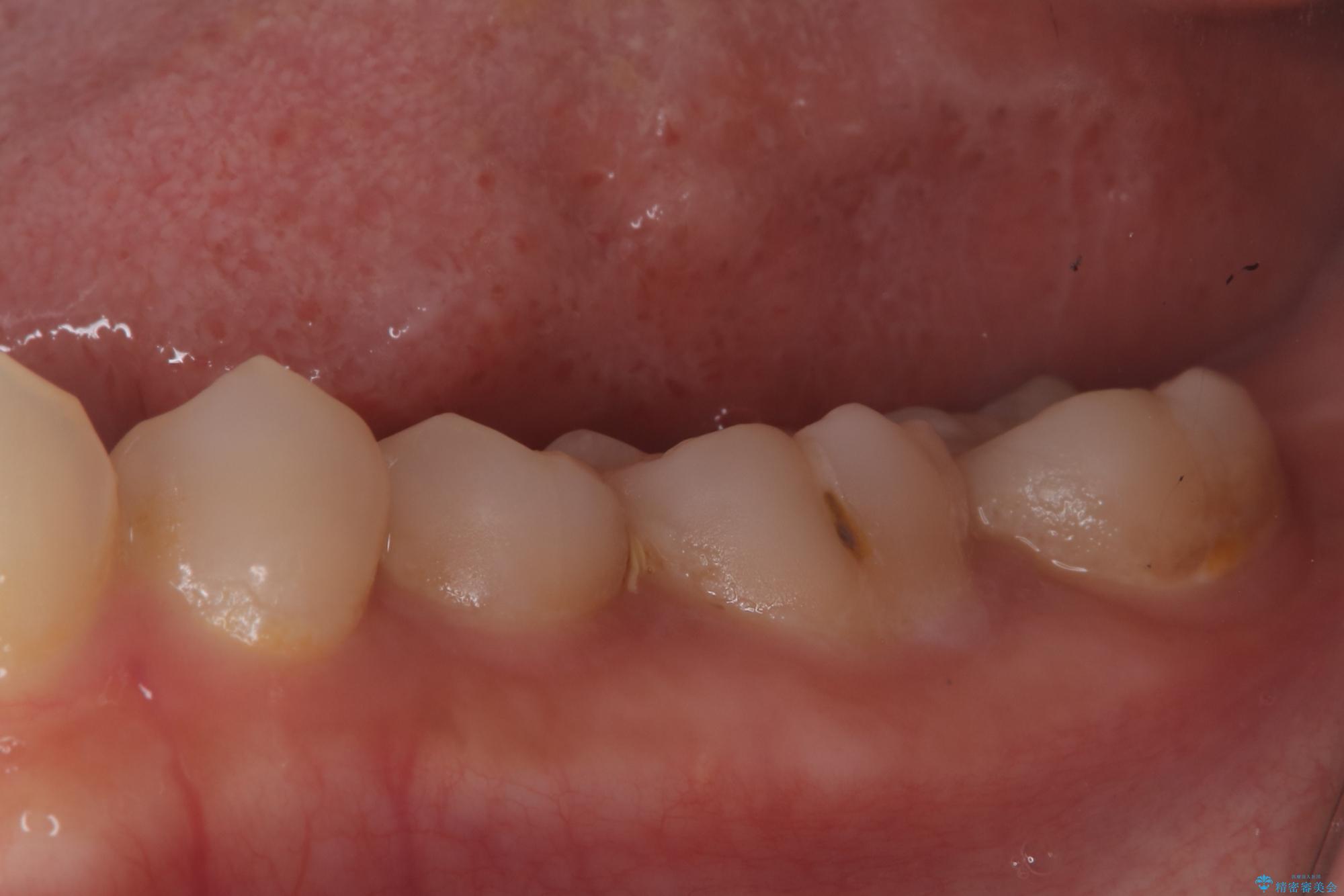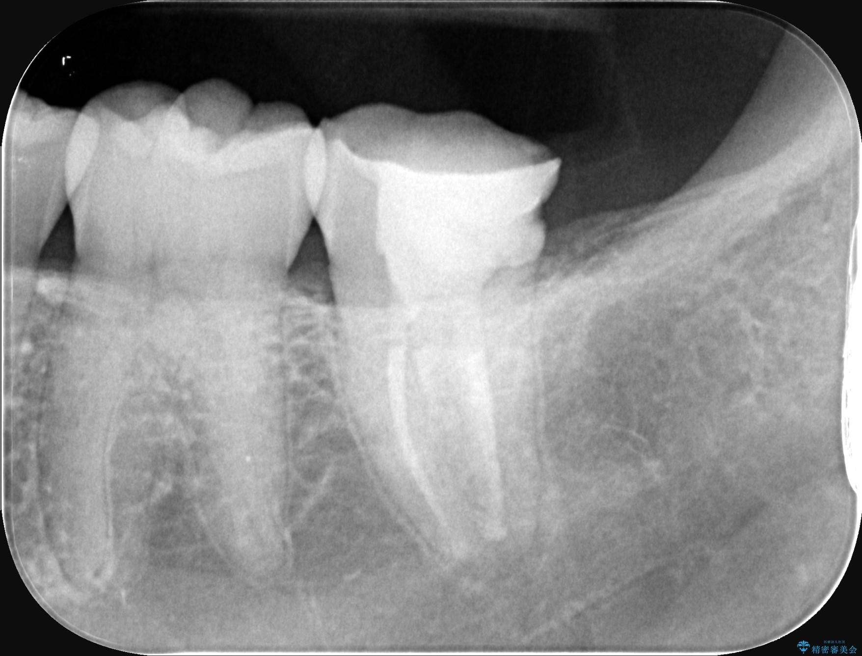 治療はまず、根管治療から始め、感染した神経を徹底的に除去することで、痛みをすぐに解消しました。再発を防ぐため、ラバーダムや顕微鏡を使って、根管内を丁寧に、そして精密に処置しました。次に、深い部分の虫歯を確実に治療するため、歯周外科処置を行い、治療しやすい環境を整えました。最後に、機能と見た目に優れたセラミッククラウンを作製・装着。根管治療から外科処置、審美修復までを一貫して行うことで、再発リスクの低い、長期的に安定して使える奥歯を取り戻していただけました。