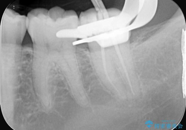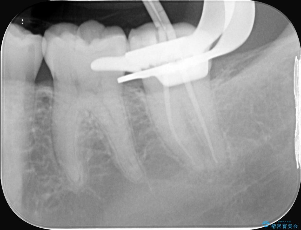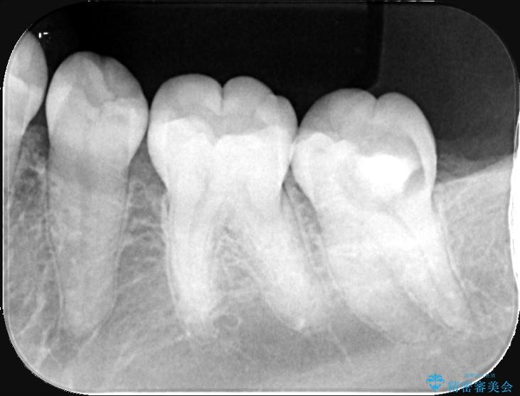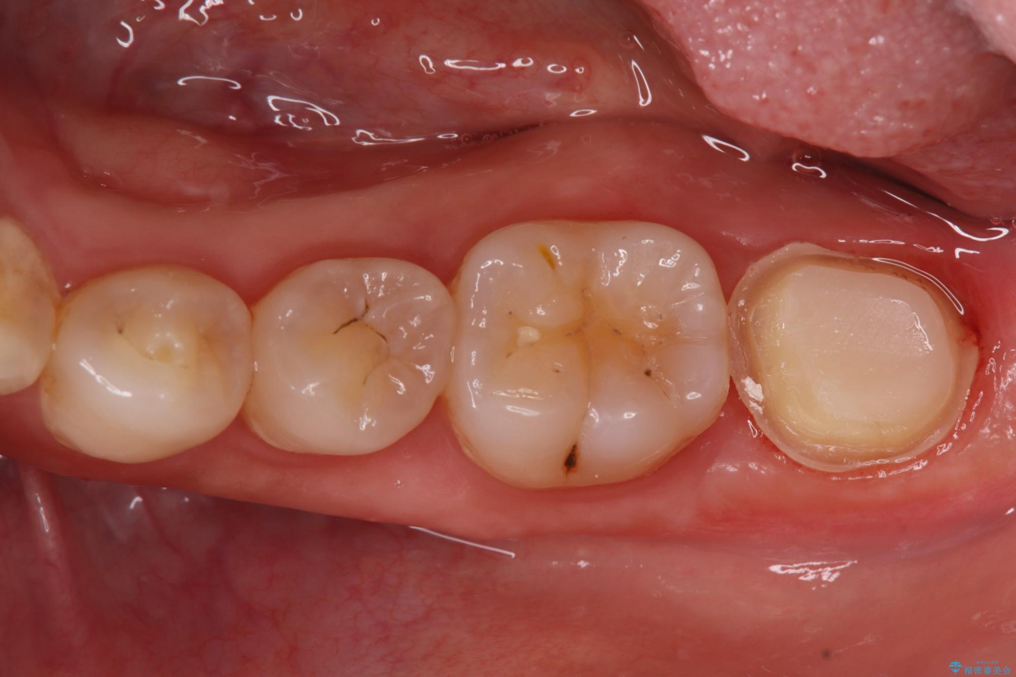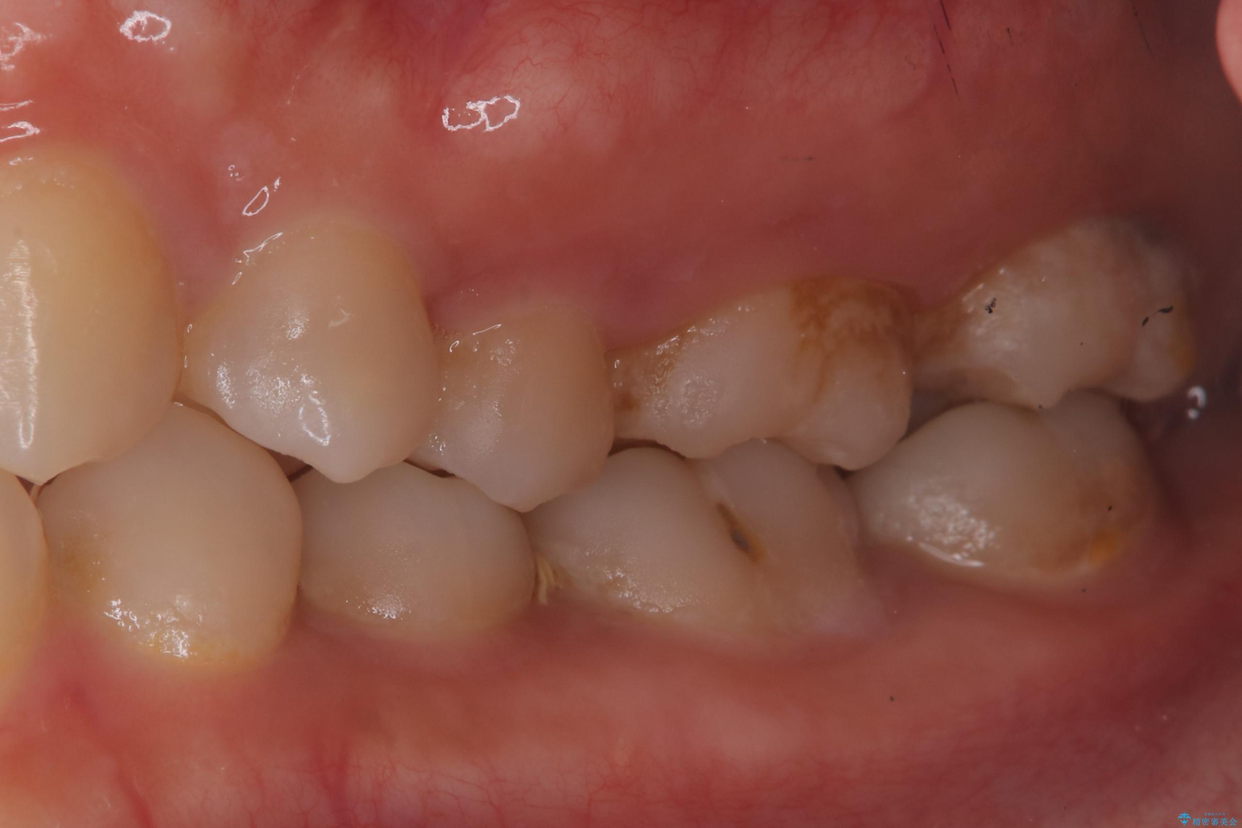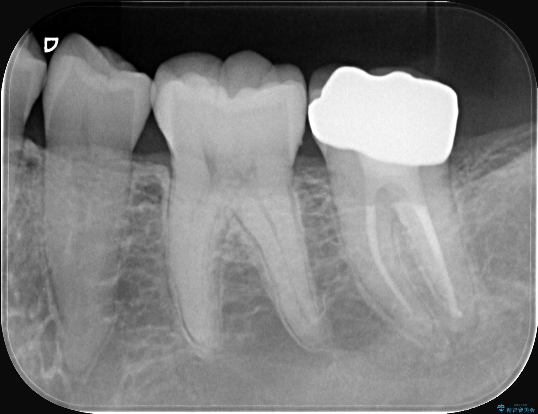 治療はまず、根管治療から始め、感染した神経を徹底的に除去することで、痛みをすぐに解消しました。再発を防ぐため、ラバーダムや顕微鏡を使って、根管内を丁寧に、そして精密に処置しました。次に、深い部分の虫歯を確実に治療するため、歯周外科処置を行い、治療しやすい環境を整えました。最後に、機能と見た目に優れたセラミッククラウンを作製・装着。根管治療から外科処置、審美修復までを一貫して行うことで、再発リスクの低い、長期的に安定して使える奥歯を取り戻していただけました。