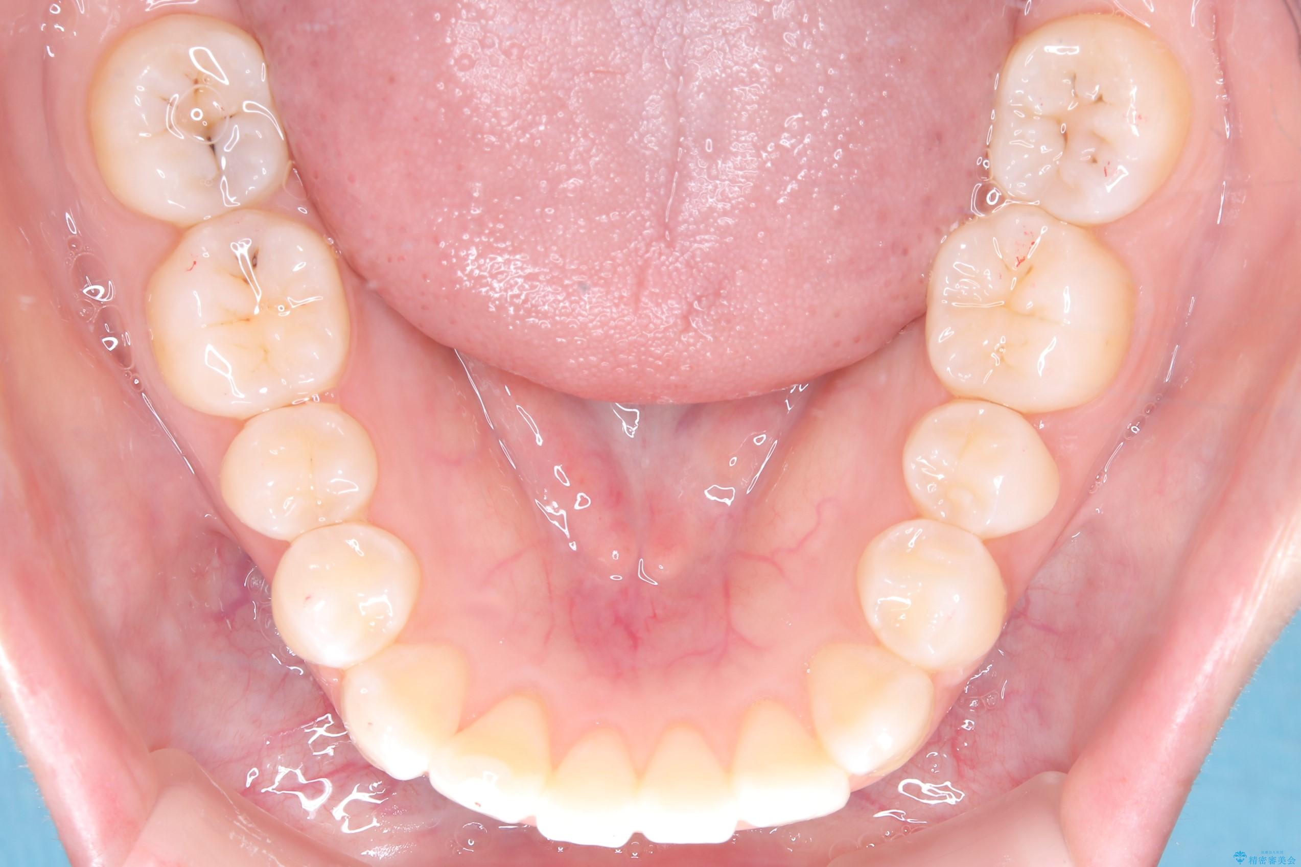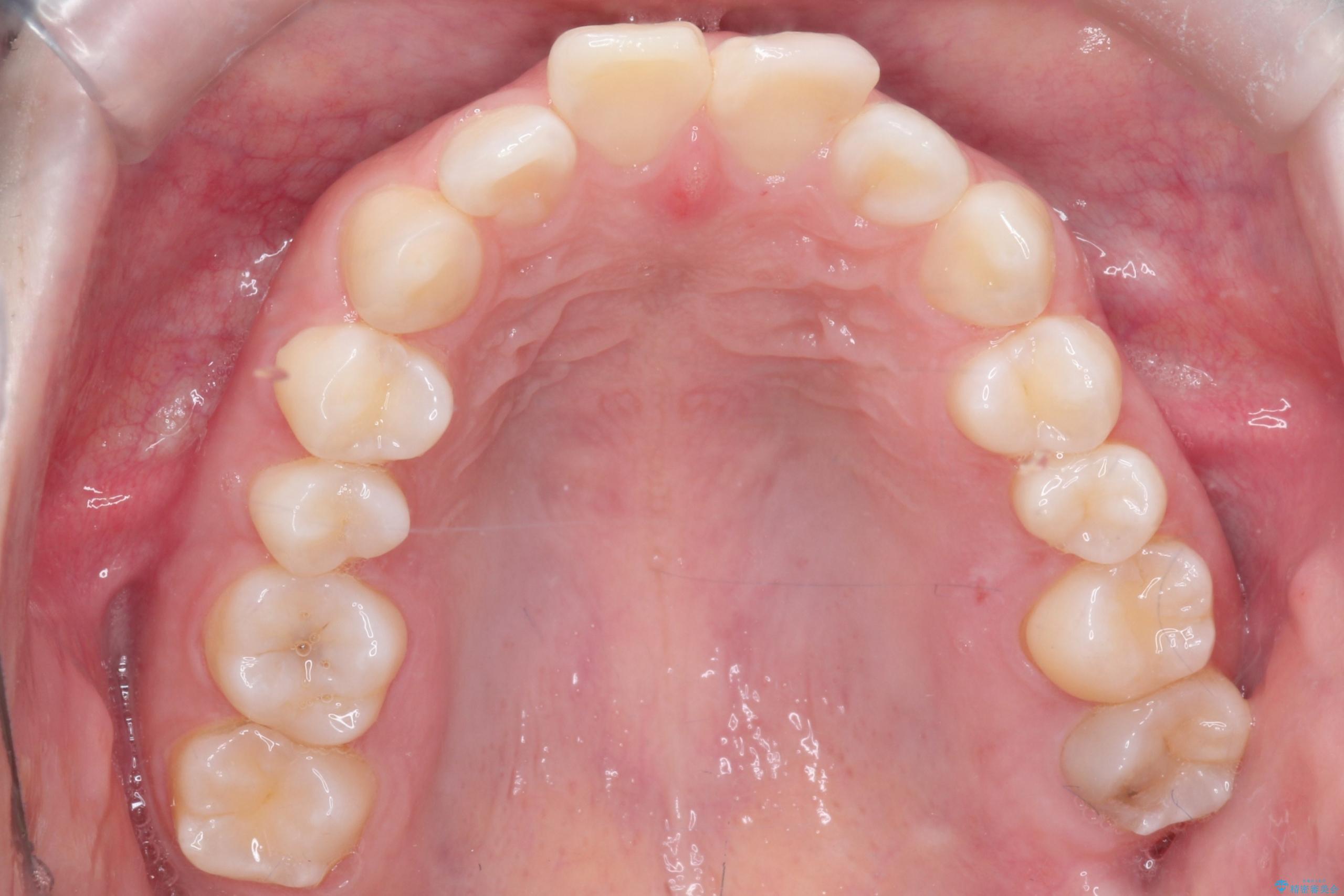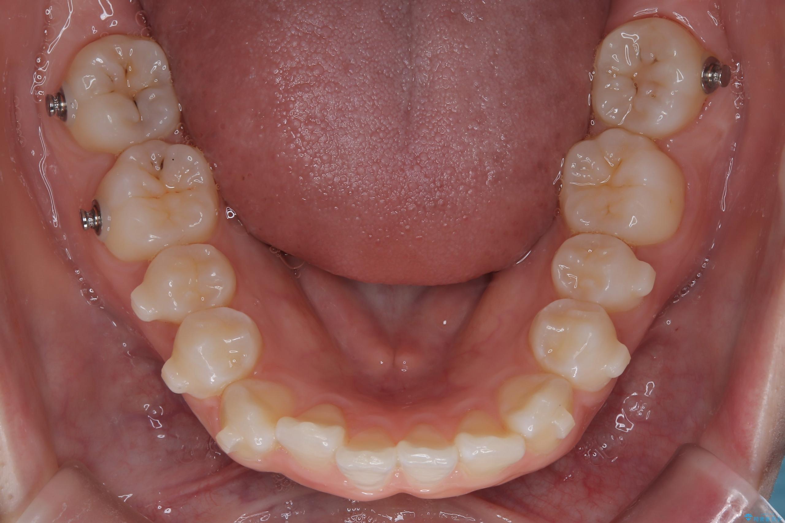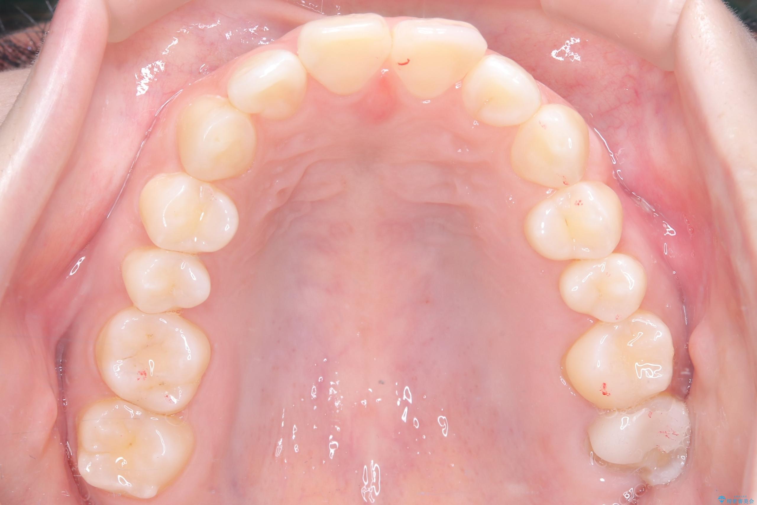 今回の矯正治療では、透明なマウスピース型の装置インビザラインを使用しました。この装置は取り外し可能で、日常生活で目立ちません。治療は、緻密に計算された計画に基づき、段階的に作製されたマウスピースを交換していくことで、奥歯から順に全体を後方へ移動させる遠心移動を実施。これにより、前歯を並べるための十分なスペースが確保され、デコボコが解消されました。抜歯することなく、機能的にも審美的にも整った美しい歯並びを獲得していただけました。