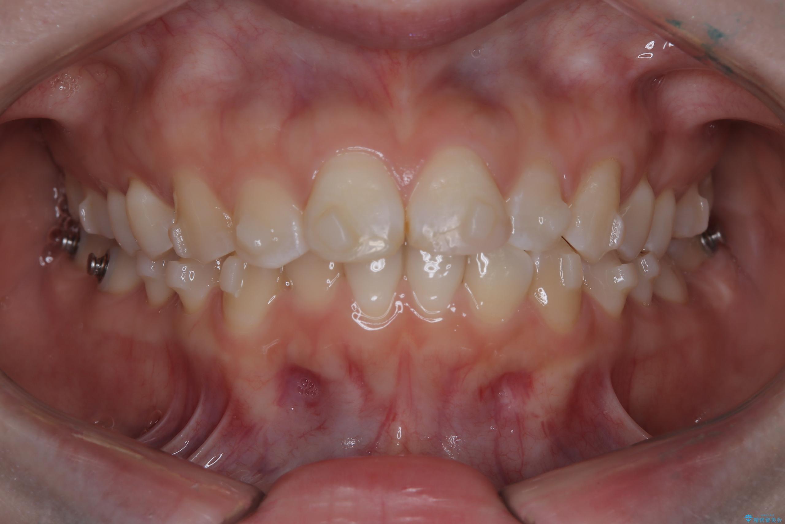 - 前歯のデコボコ(叢生)を気にされてご来院されました。精密な検査の結果、歯が並ぶスペースが不足していることが判明。患者様のご希望から、透明で目立ちにくいインビザライン(マウスピース矯正)による治療計画を立案しました。抜歯を避け、奥歯全体を奥へ動かす遠心移動という方法でスペースを確保し、前歯の叢生を解消することを目指します。