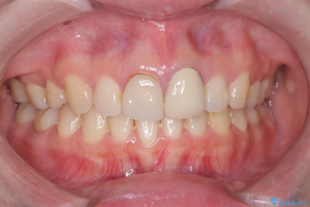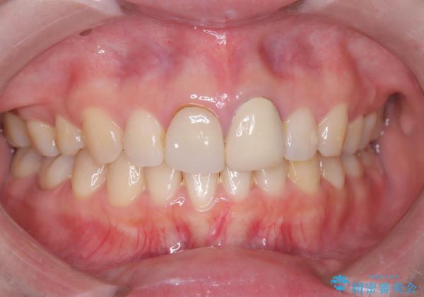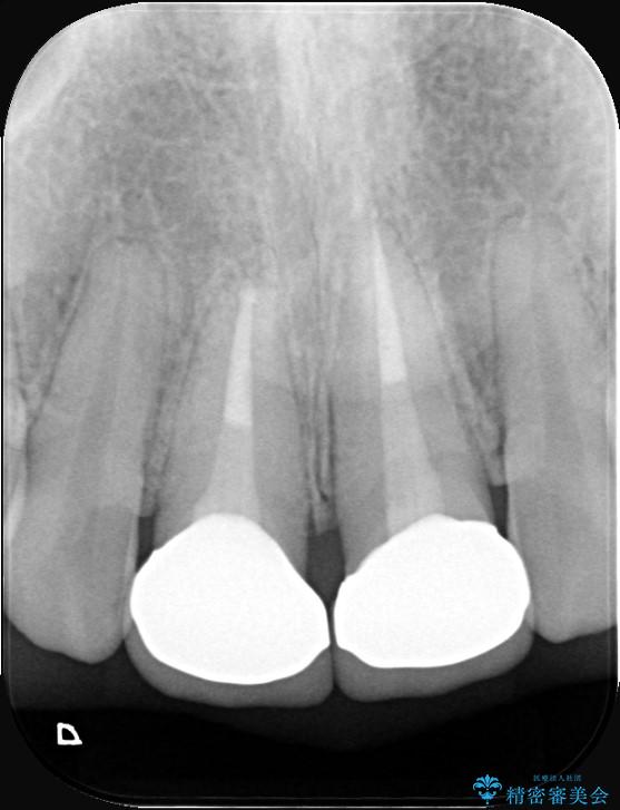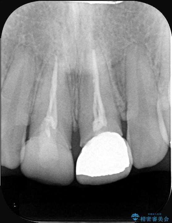 - 以前他院で治療した前歯の被せものの見た目の不満を主訴にご来院されました。レントゲンと診査の結果、被せものの不適合だけでなく、その土台となる歯の根管充填(根の治療の詰め物)が不十分であることが判明。再感染のリスクを避けるため、まず精密根管治療を行い、その後に最も審美性に優れたオールセラミッククラウンで修復する治療計画を立案しました。これにより、見た目の改善と歯の寿命の長期化を目指しました。
