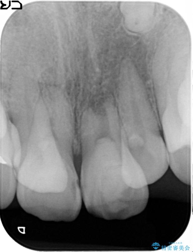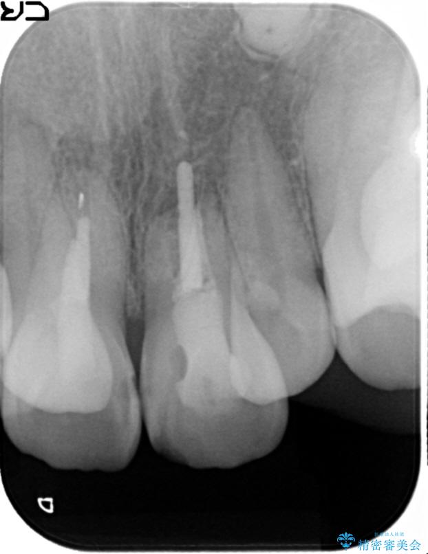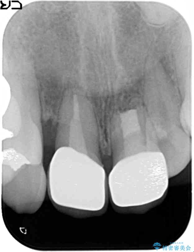 X線写真より、充填剤の突き出た状態の根管治療の再治療を行い、セラミック治療を計画すると同時に、