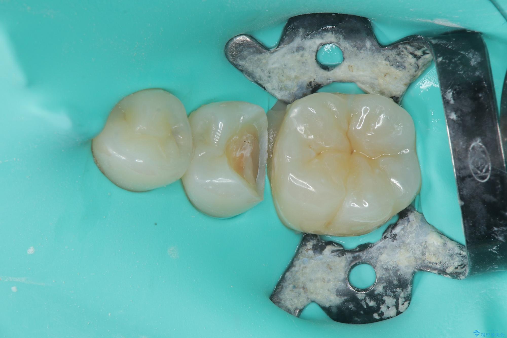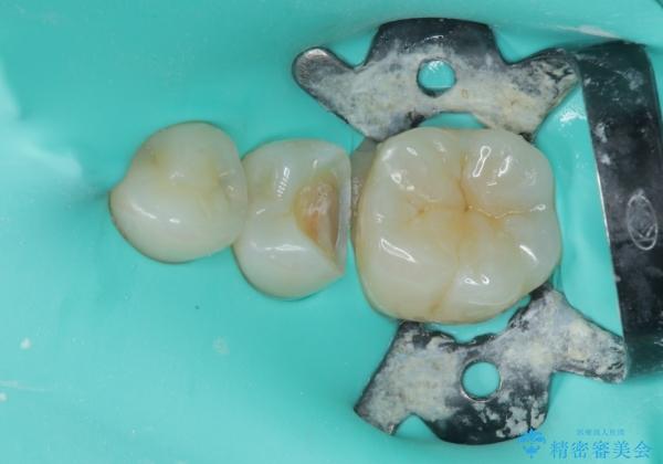 拡大鏡視野下で虫歯の除去を行い、セラミックインレーに適した形に整えました。