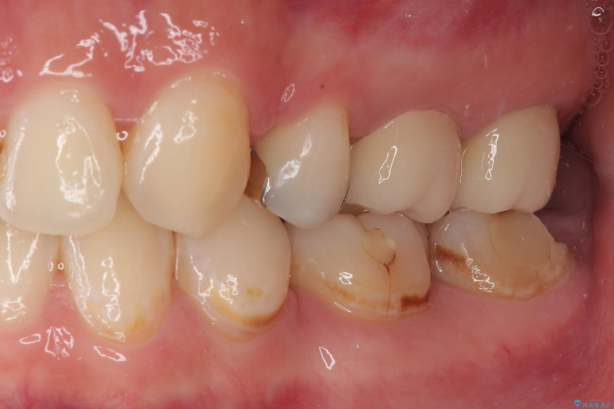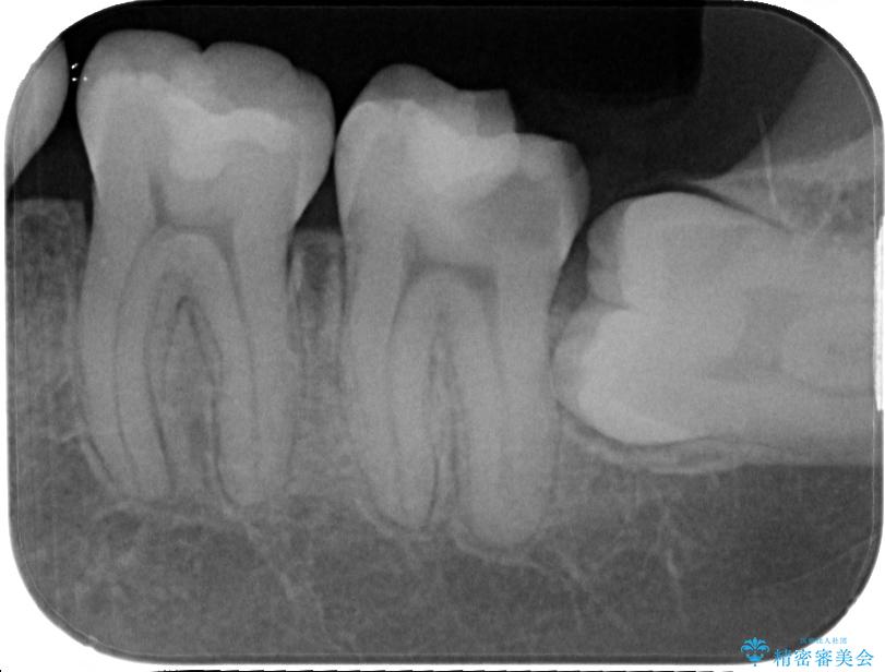 左下の虫歯が歯茎の下にも広がっているので、歯茎の位置を下げるためディスタルウェッジを行い埋伏親知らず抜歯を行いました。また同日に左下の歯を仮歯に変えています。