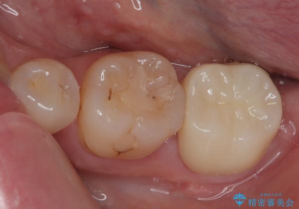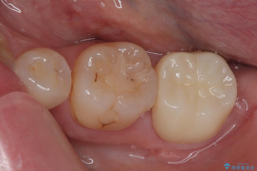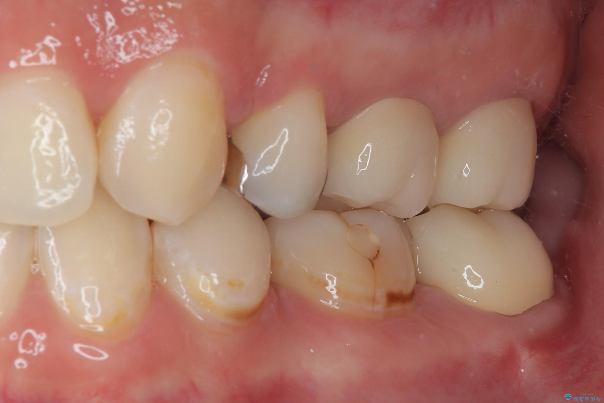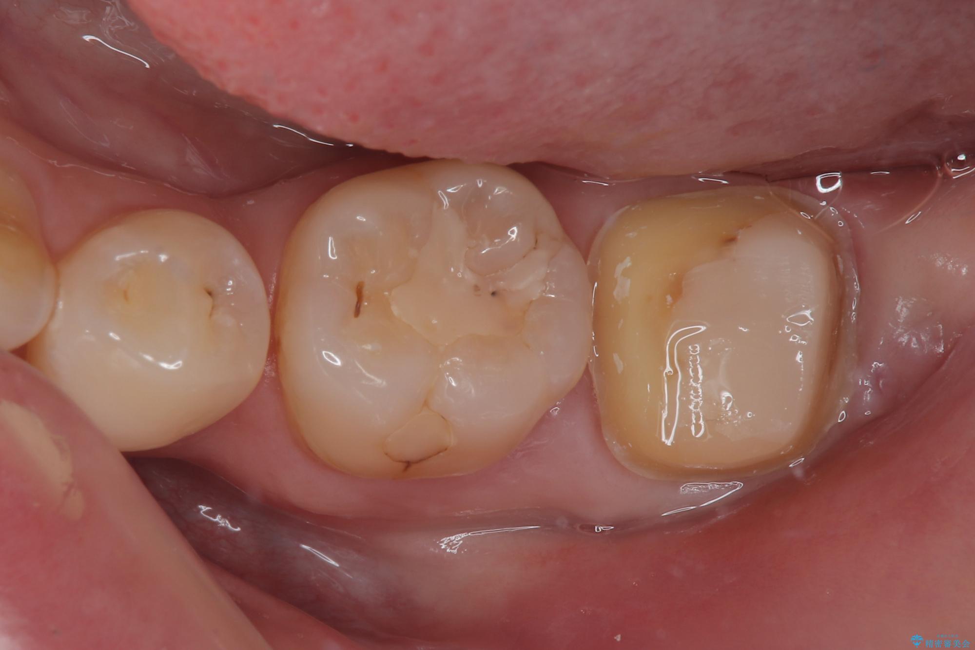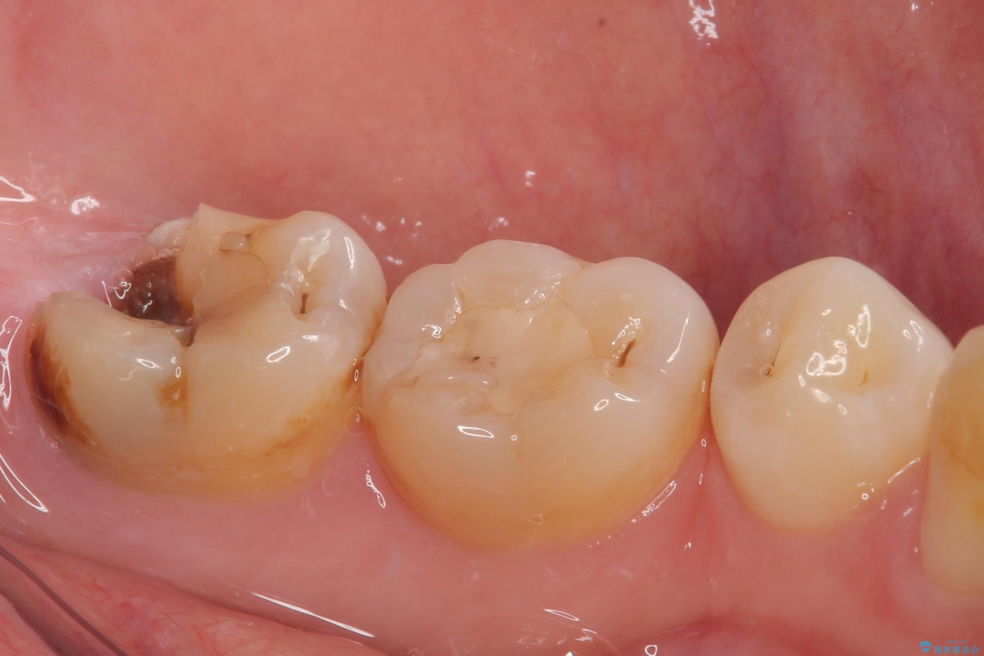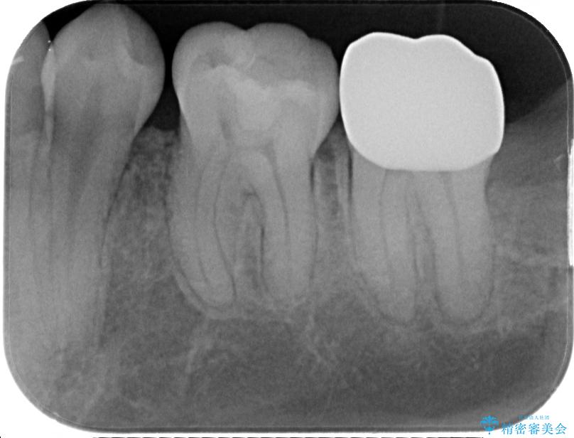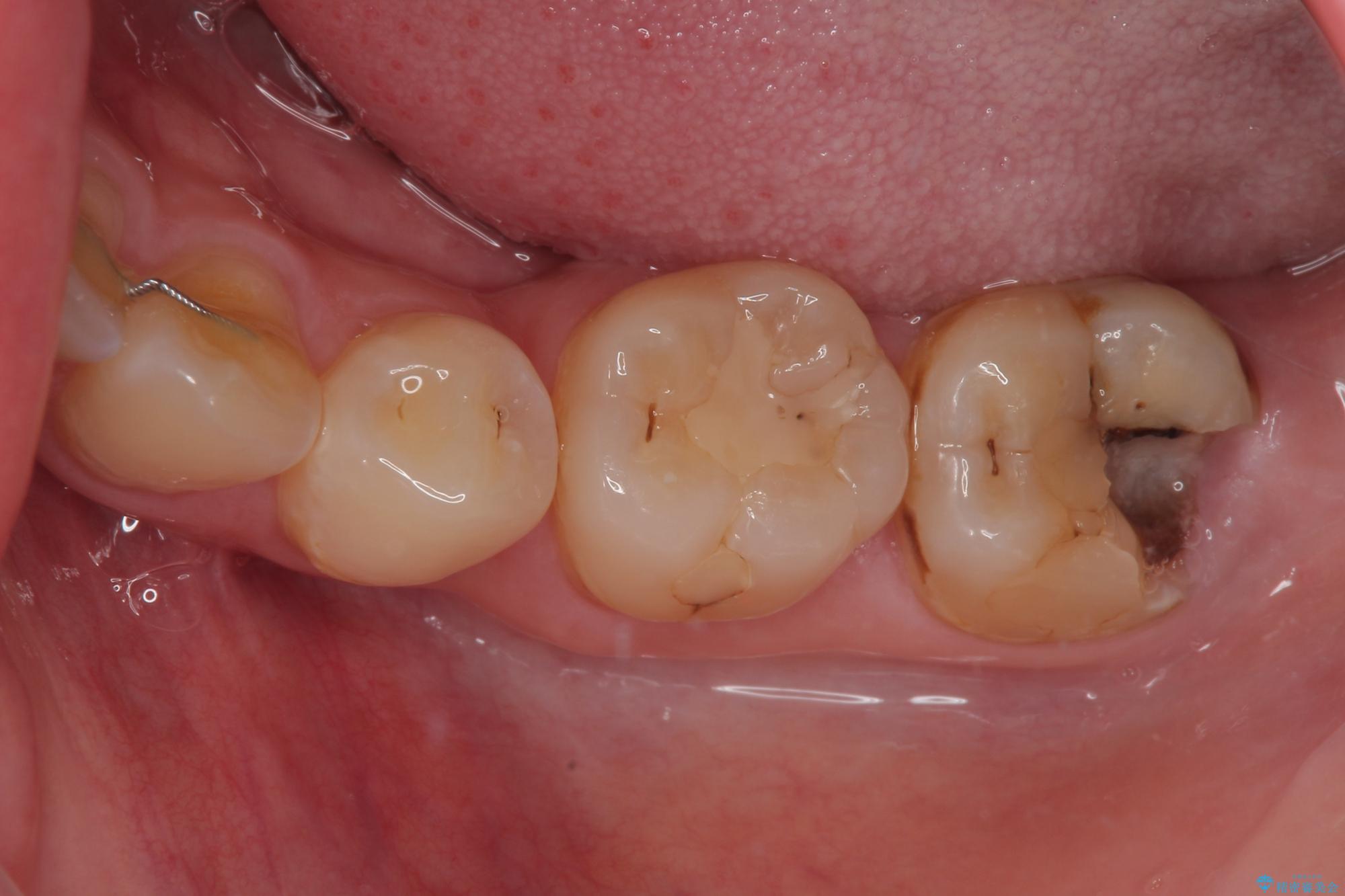 - 左下の奥歯が欠けたとのことで来院された患者様です。検査の結果、埋まっている親知らず抜歯とその手前の左下の7番目の歯のフルジルコニアクラウンによる補綴治療をおこなっていくこととしました。