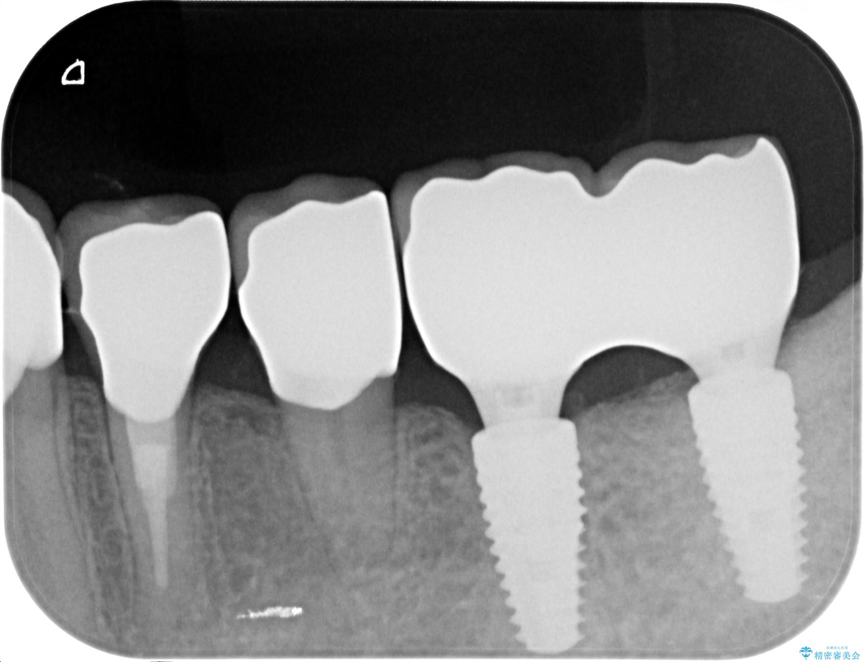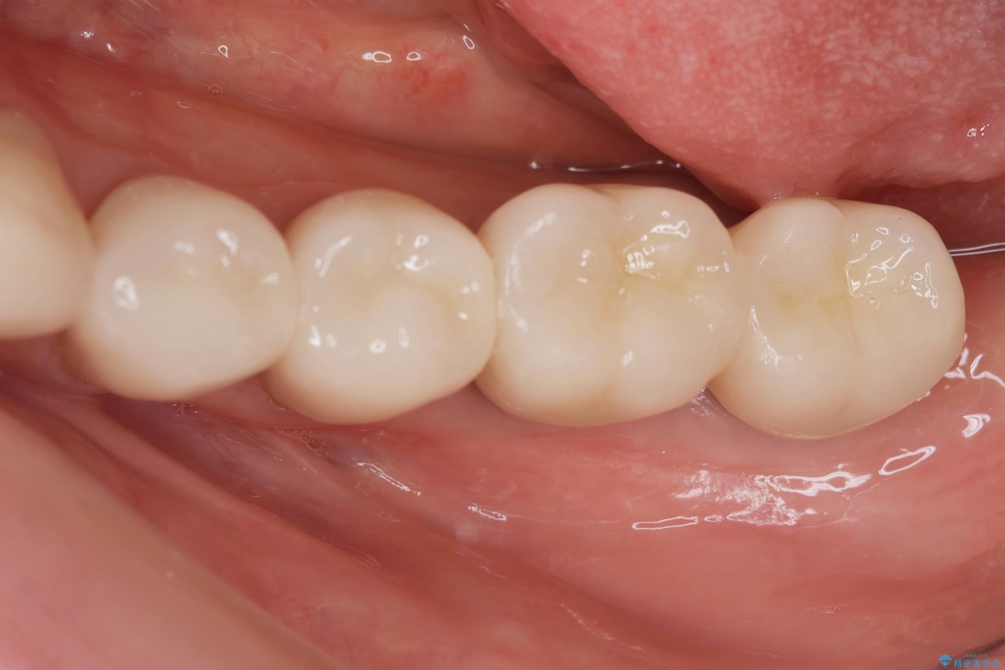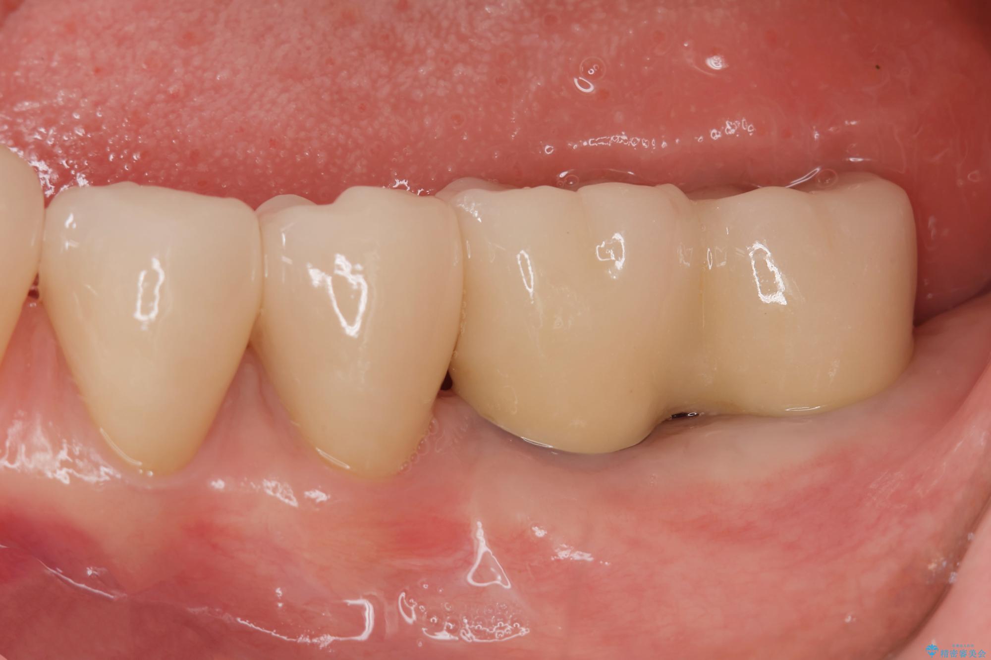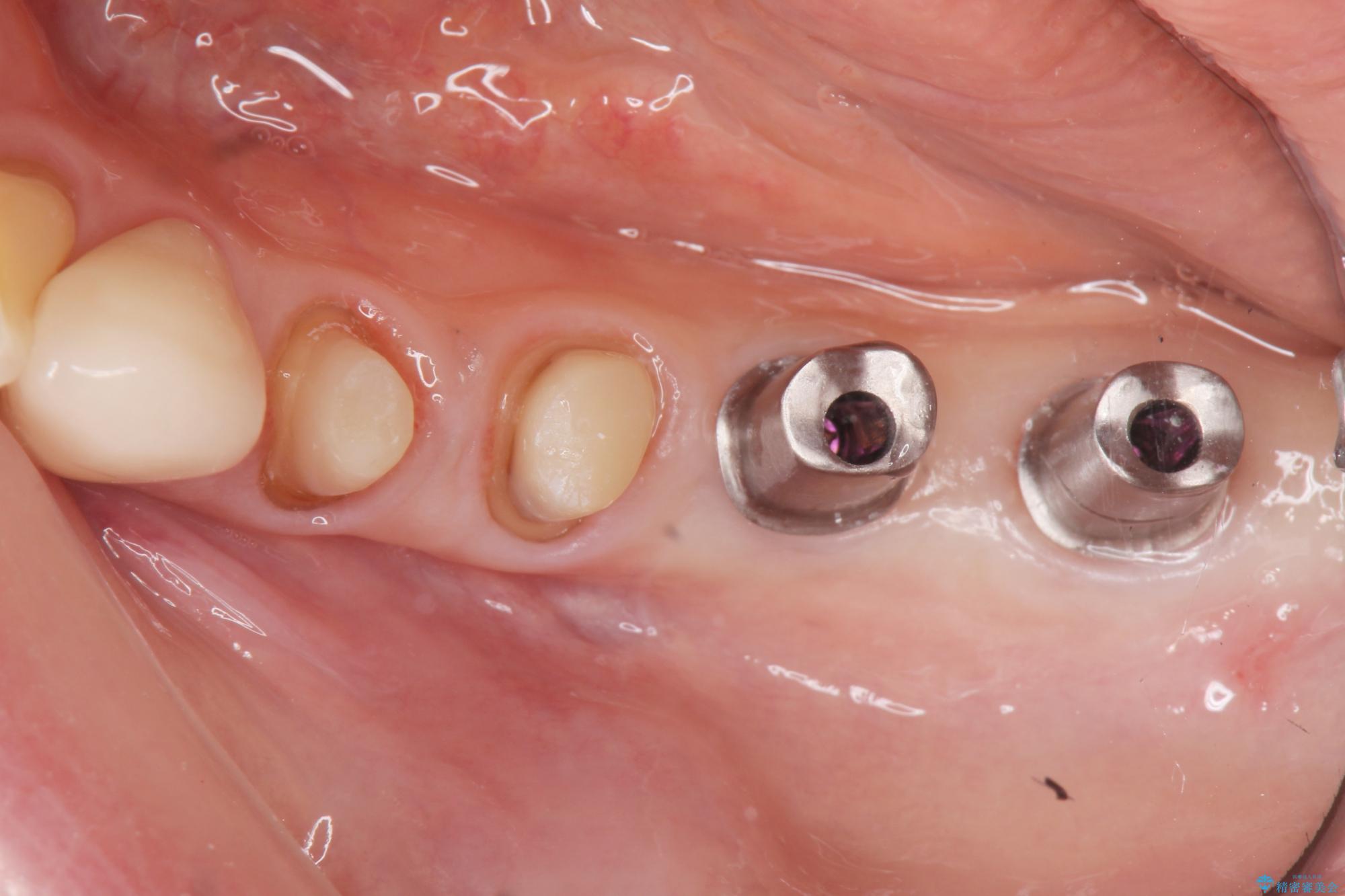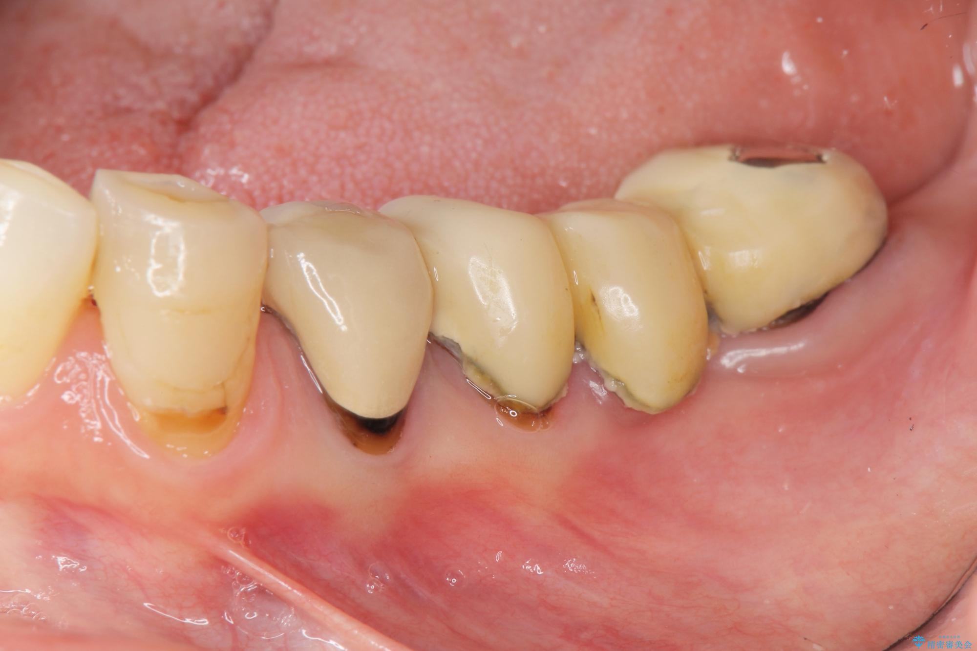 ブリッジの支台となる後方臼歯は清掃性が悪く虫歯が大きくなっていたため、抜去を行いインプラントを用いた治療としました。