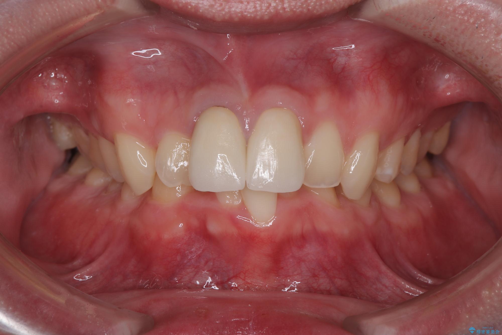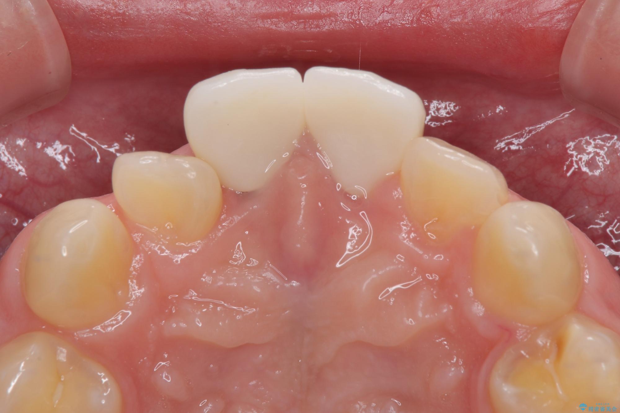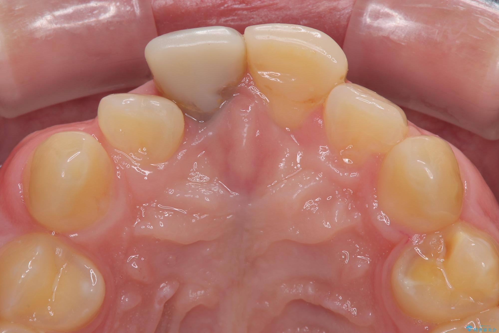 噛み合わせを改善するための矯正治療をご提案しましたが、患者様のご希望により矯正治療と根管治療の再治療は行わず、ファイバーコア(土台)+オールセラミッククラウンによる補綴治療を選択しました。