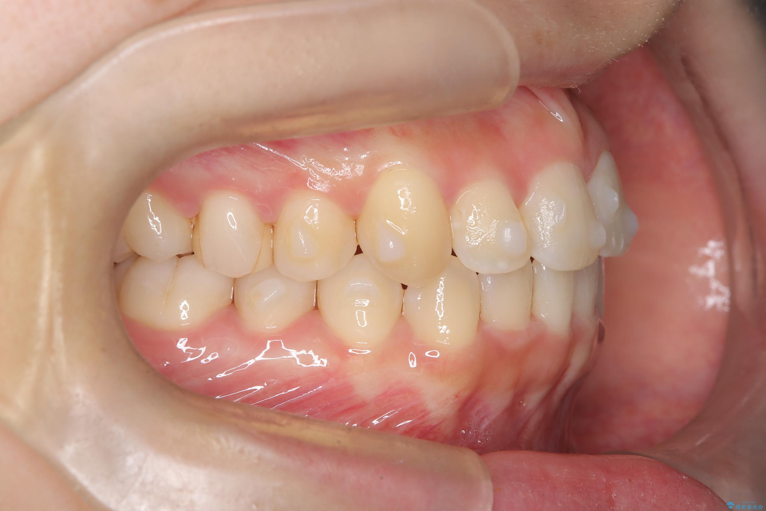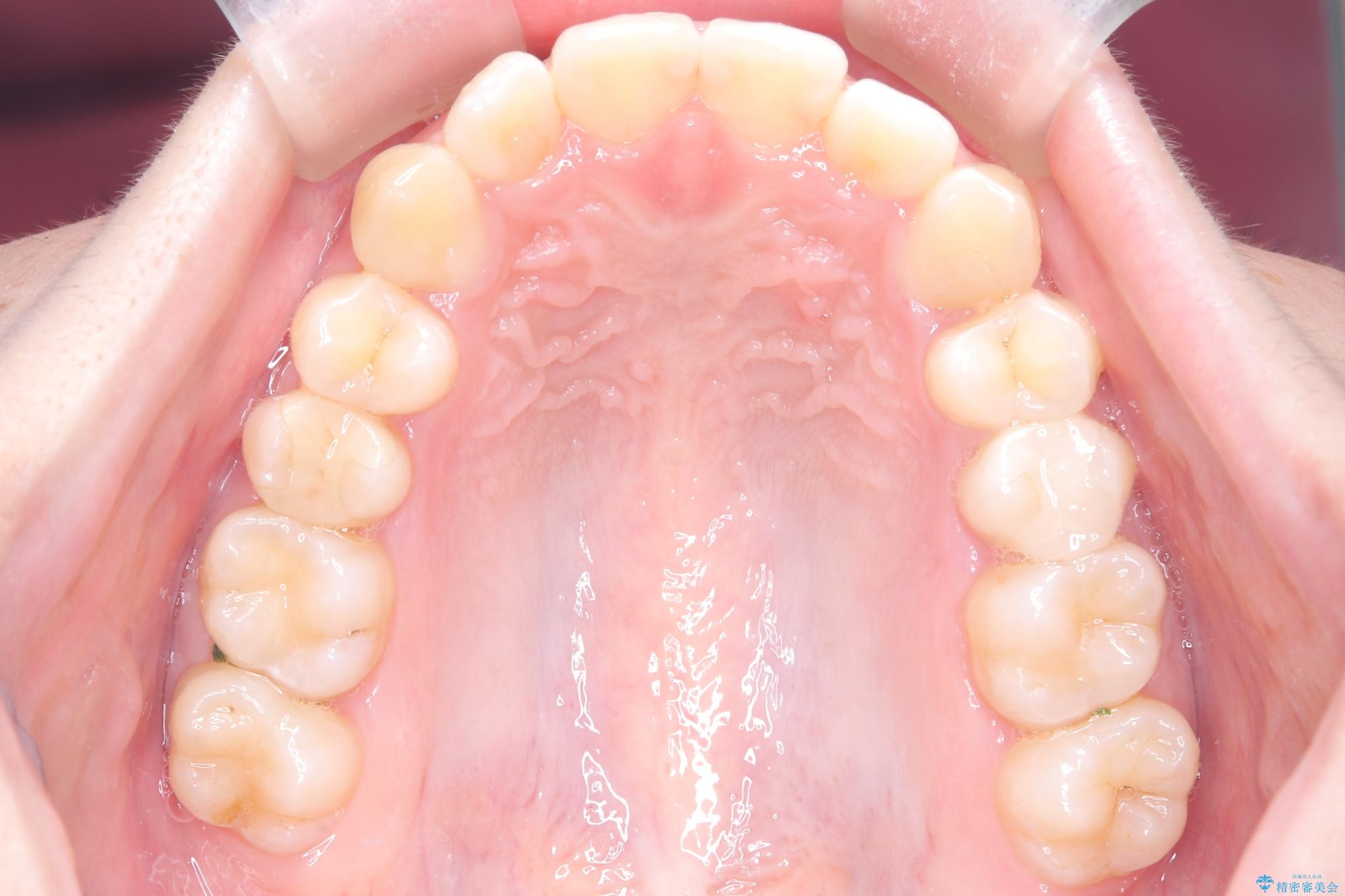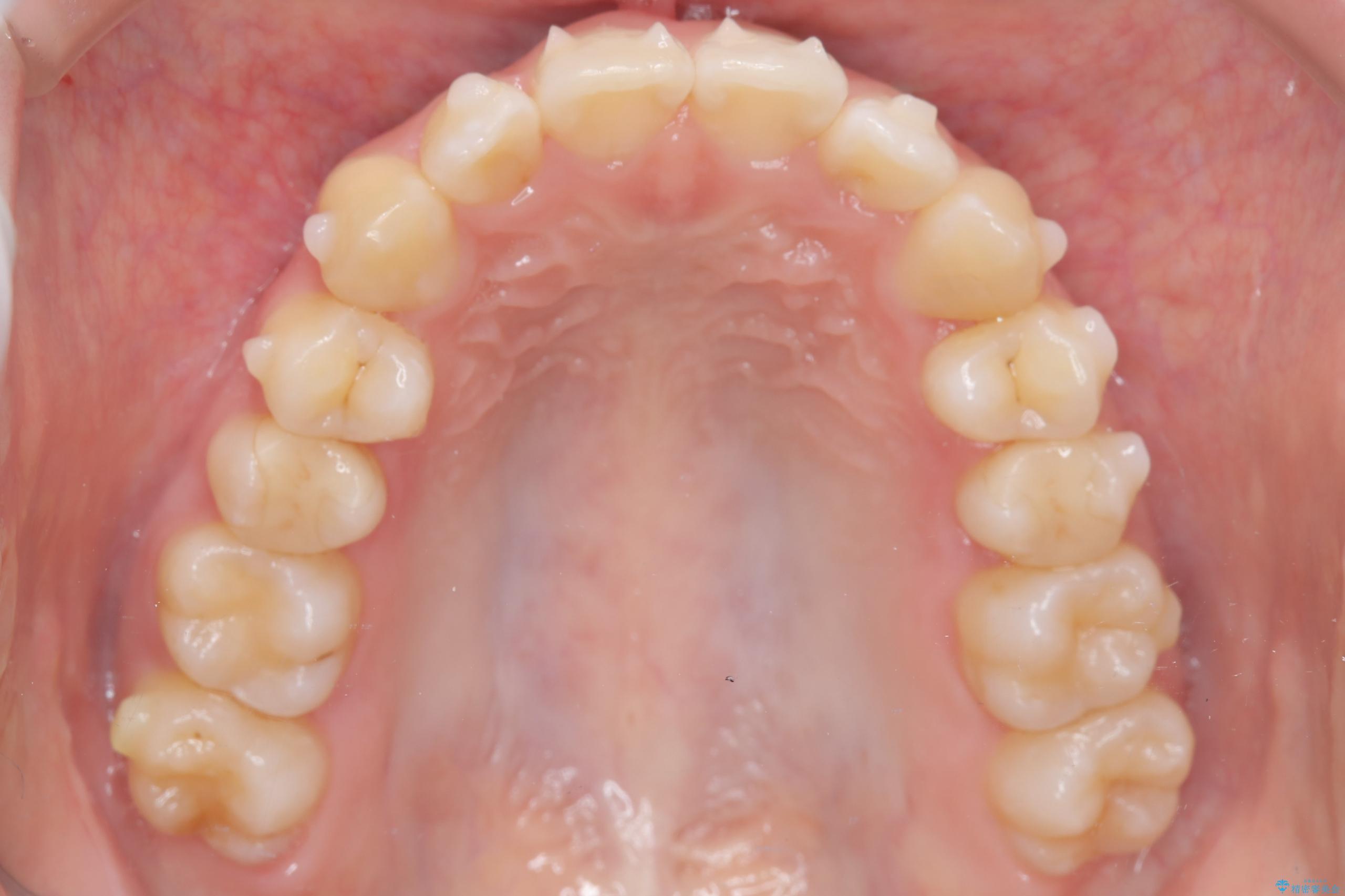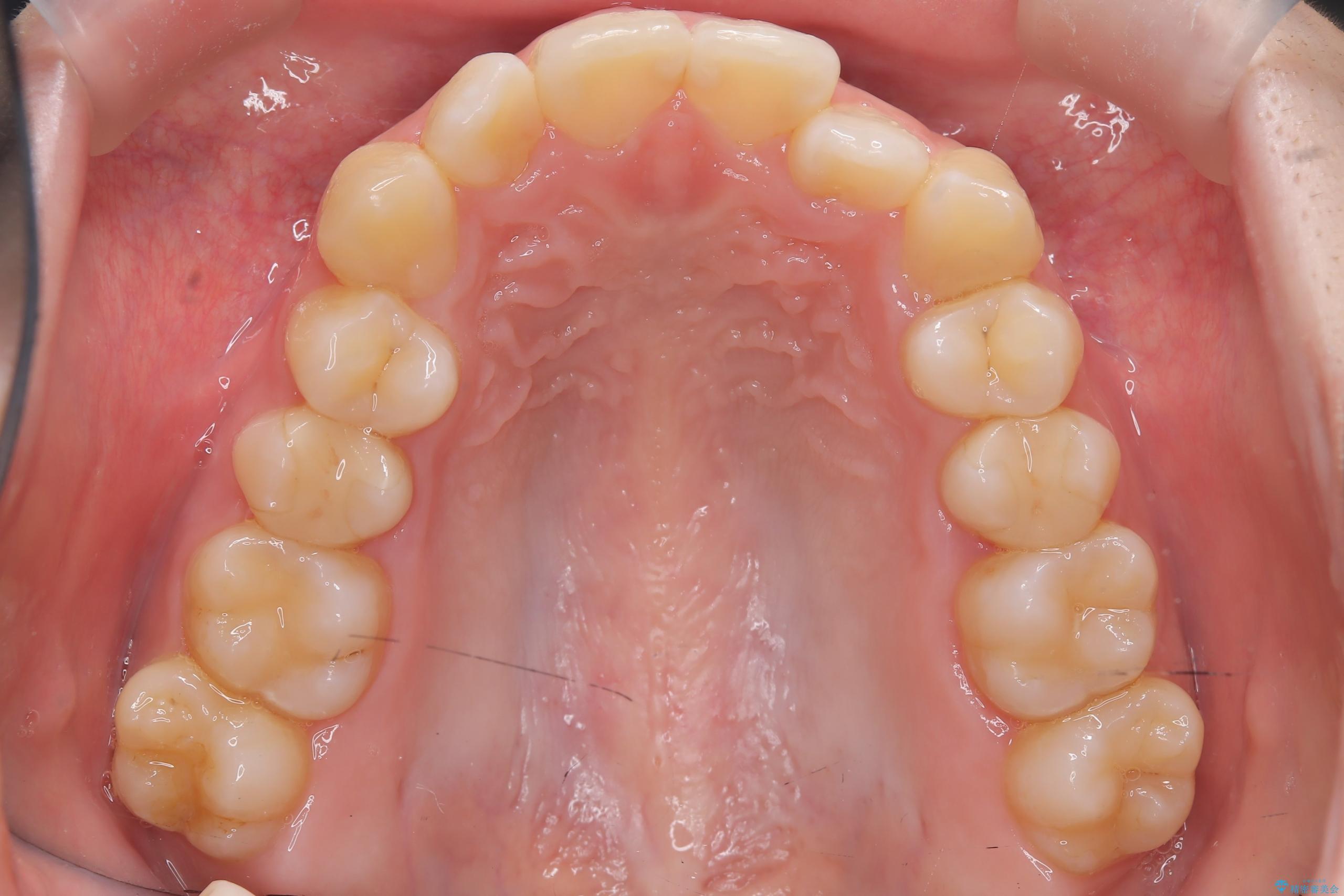 今回の矯正治療では、透明なマウスピース型の装置インビザラインを使用しました。治療は、緻密なデジタル計画に基づき、奥歯から順に歯列全体を後方へ移動させる遠心移動を実施し、前歯を前に出すためのスペースを確保しました。このスペースを利用して、内側に入り込んでいた右上2番をスムーズに前方に誘導し、正常な咬み合わせへと改善。目立たないインビザラインで、機能的な咬み合わせと美しい前歯の並びを獲得していただけました。