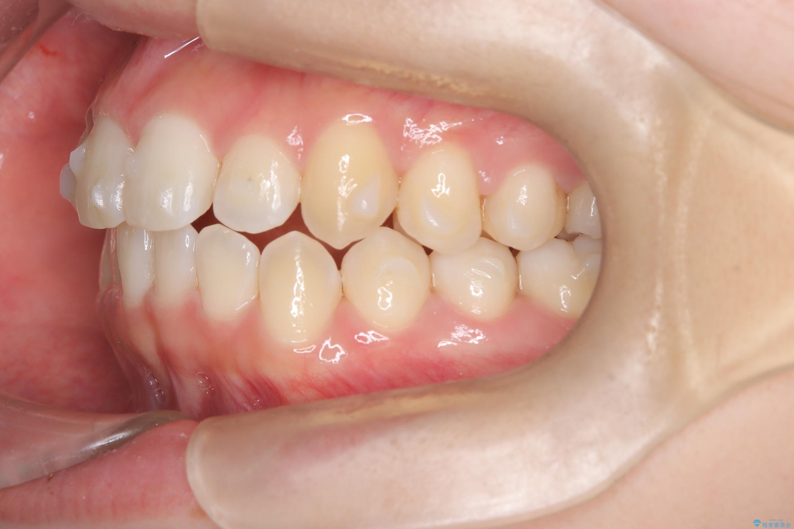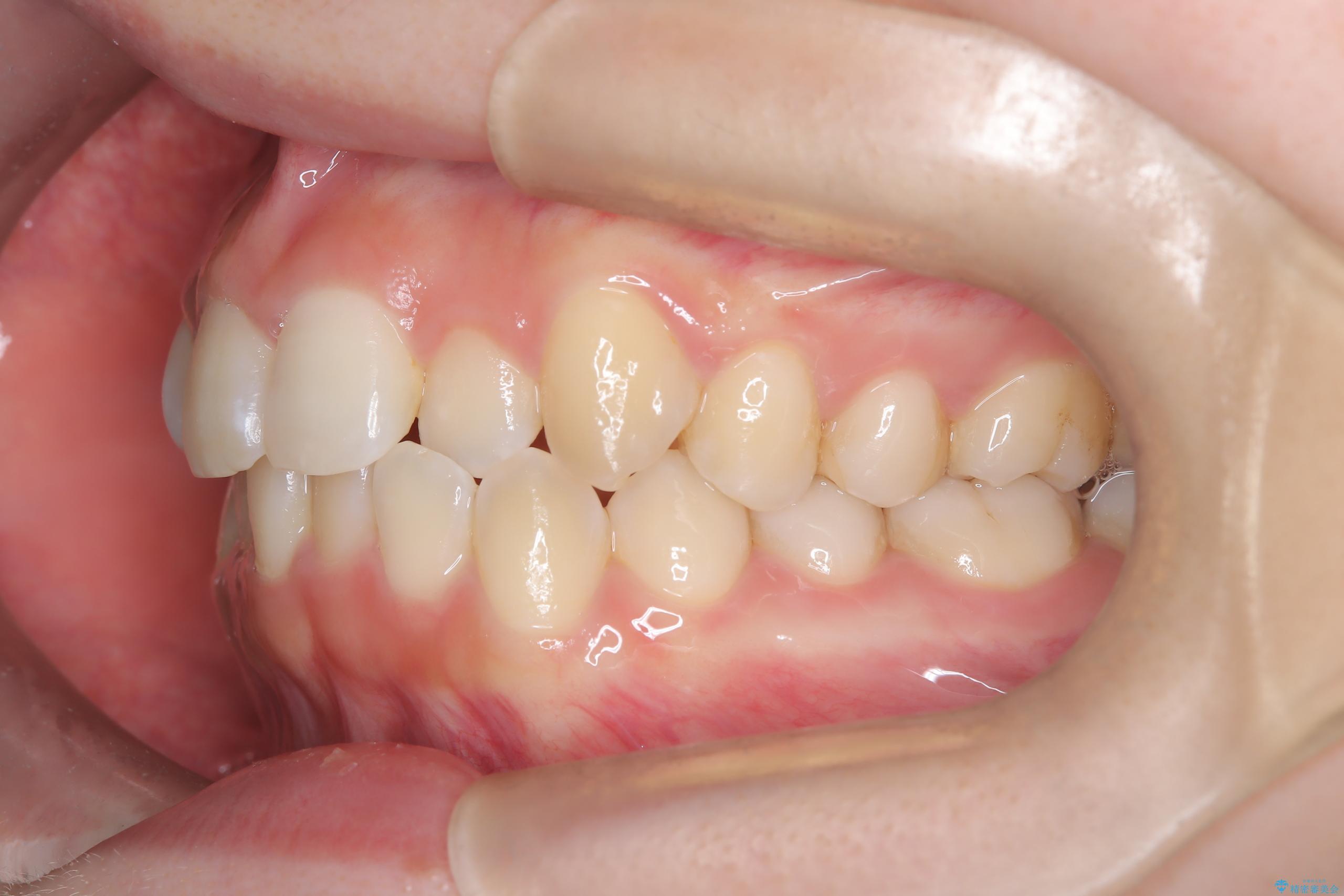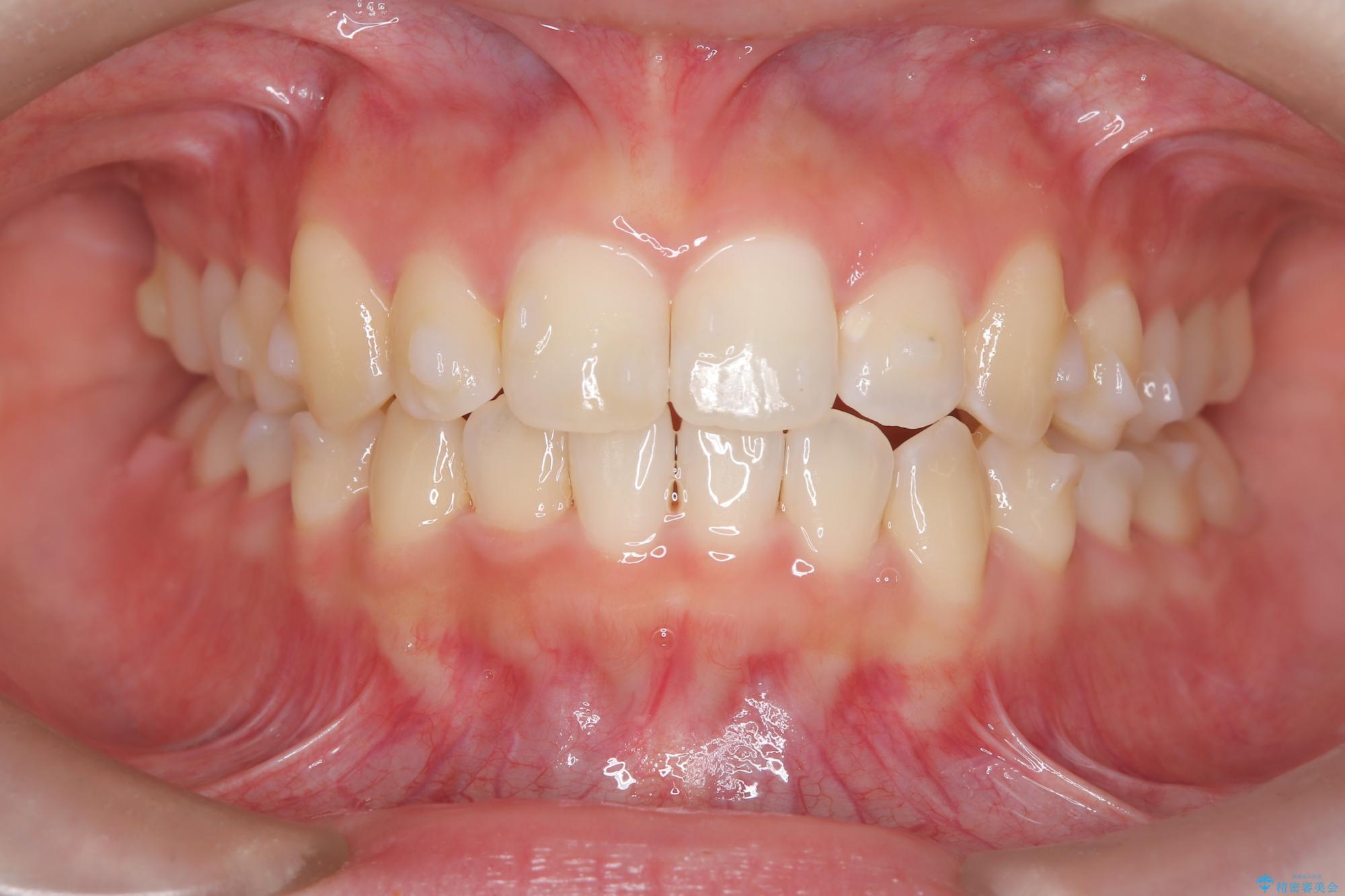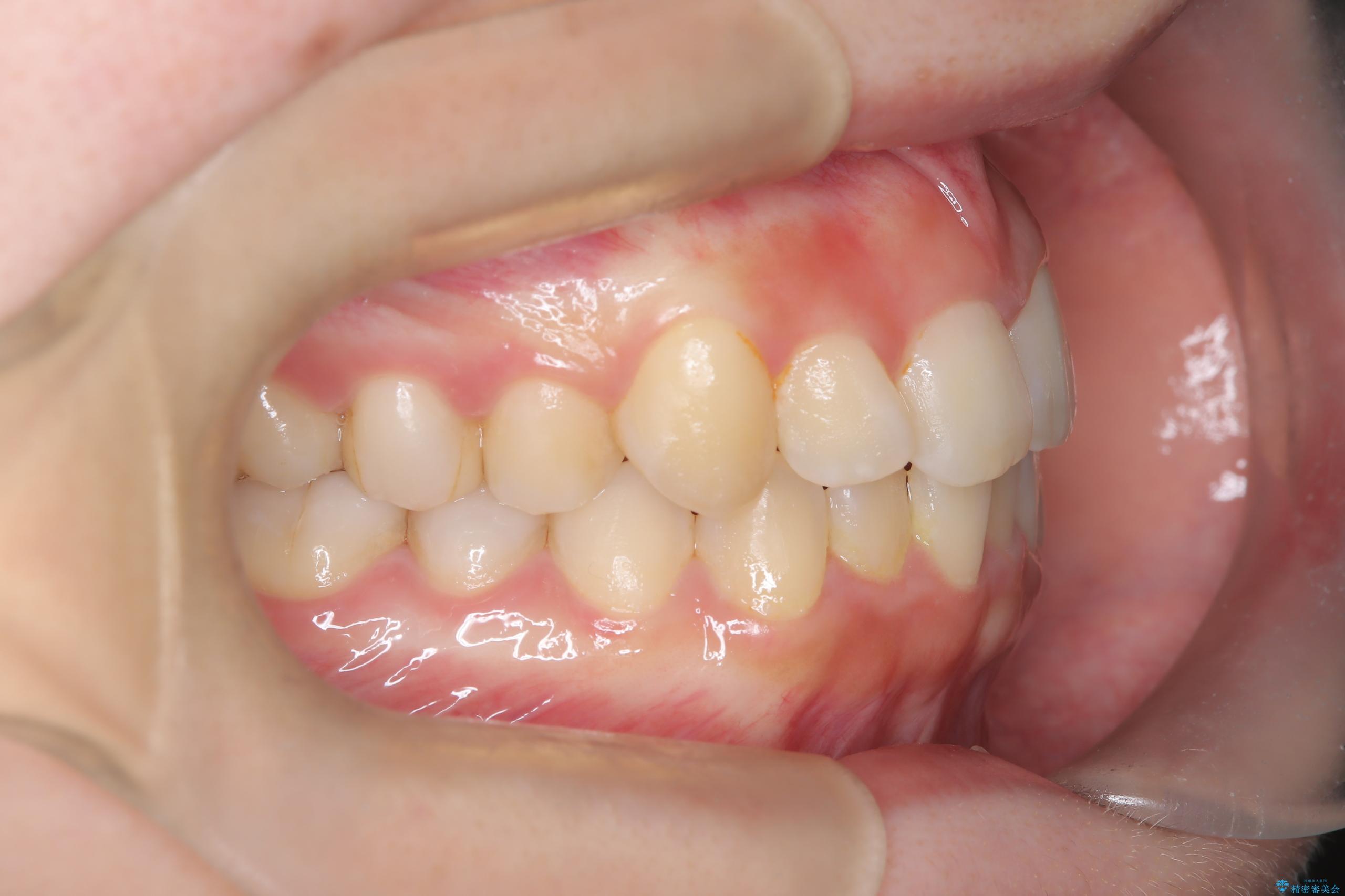 今回の矯正治療では、透明なマウスピース型の装置インビザラインを使用しました。治療は、緻密なデジタル計画に基づき、奥歯から順に歯列全体を後方へ移動させる遠心移動を実施し、前歯を前に出すためのスペースを確保しました。このスペースを利用して、内側に入り込んでいた右上2番をスムーズに前方に誘導し、正常な咬み合わせへと改善。目立たないインビザラインで、機能的な咬み合わせと美しい前歯の並びを獲得していただけました。