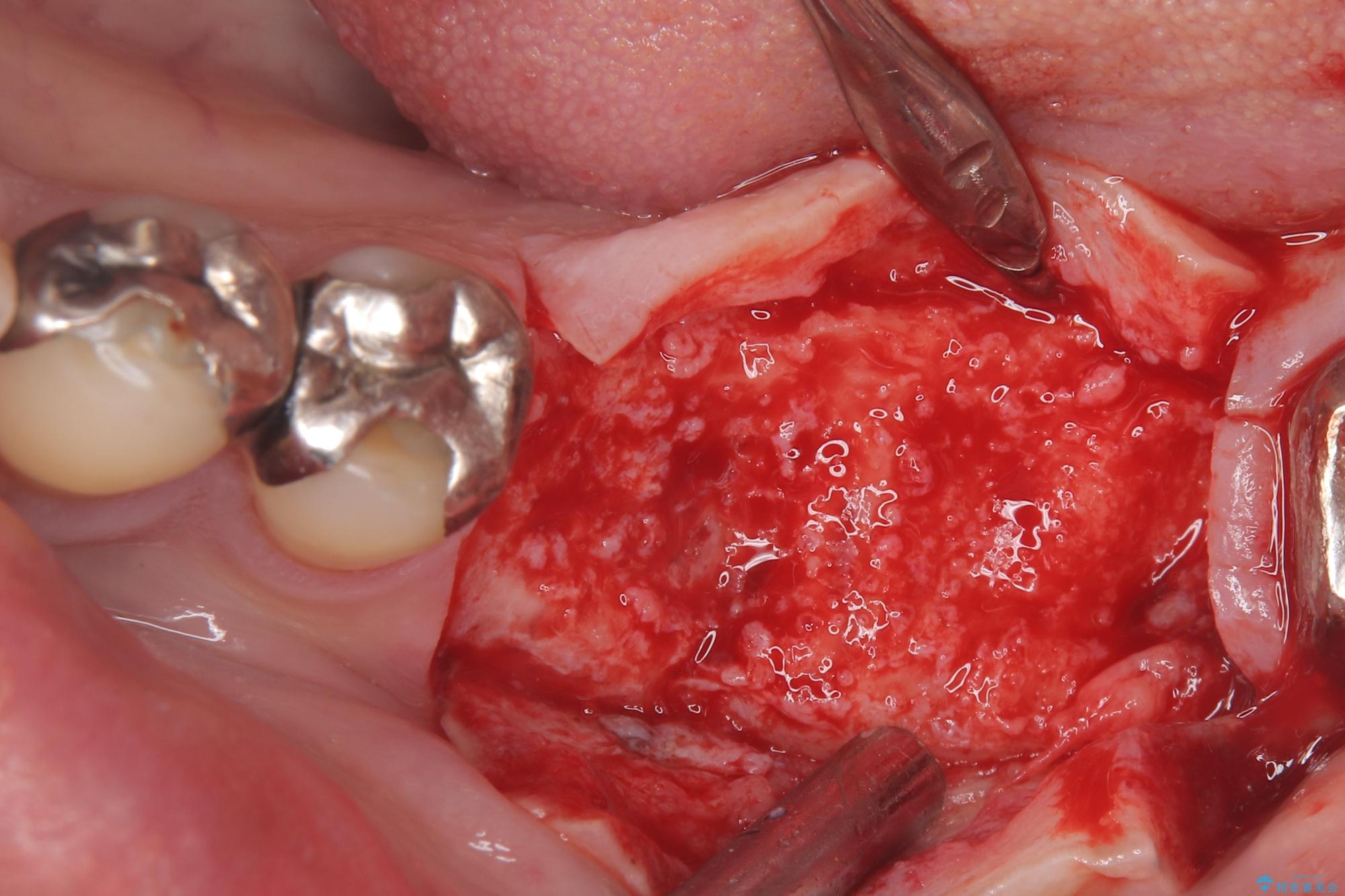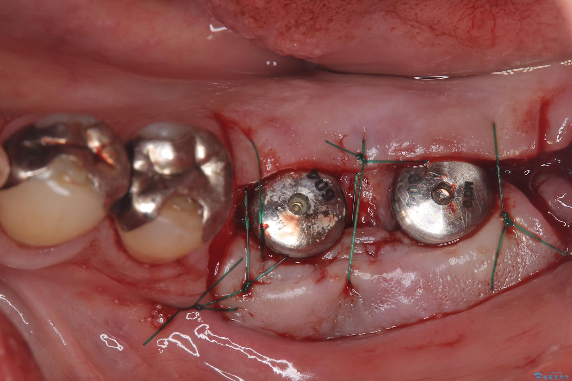 - 左下の奥歯(6番と7番)を失い、現在ご使用の部分入れ歯の不満(動く、噛めない)を主訴にご来院されました。患者様から「しっかりと噛める歯を取り戻したい」という強いご希望があり、精密な診査の結果、残りの歯への負担が少なく、最も安定した機能回復が期待できるインプラント治療を提案しました。治療計画は、左下6番と7番の欠損部に2本のインプラントを埋入し、約3ヶ月で最終的な歯まで装着することを目指しました。