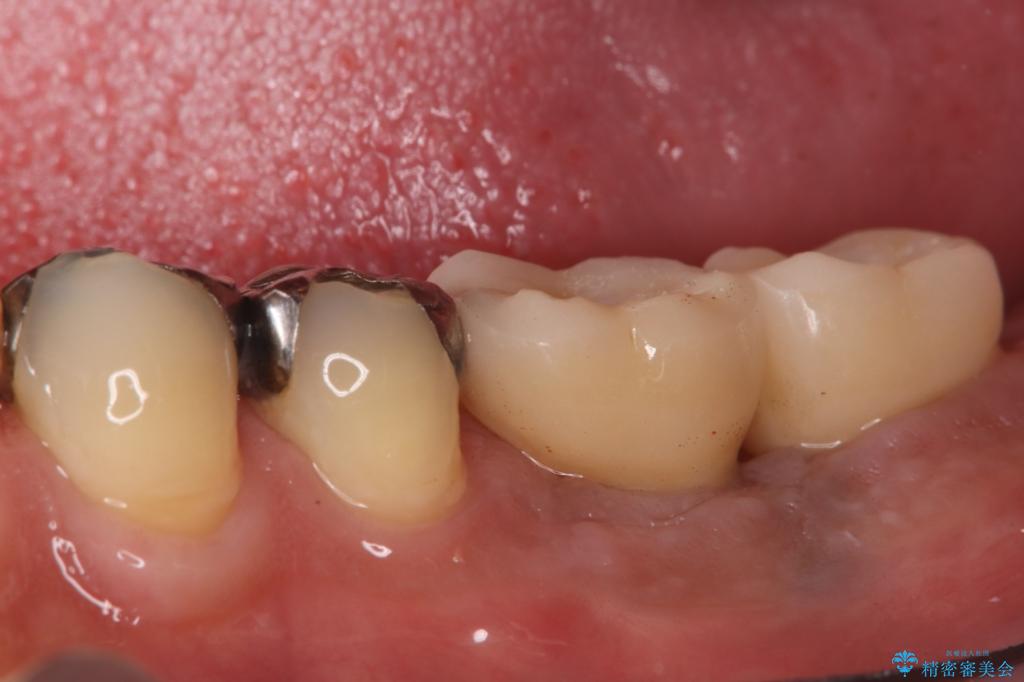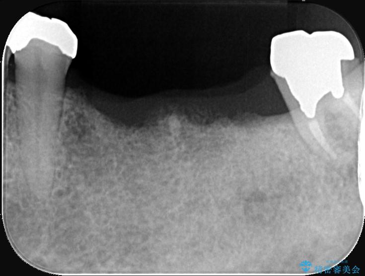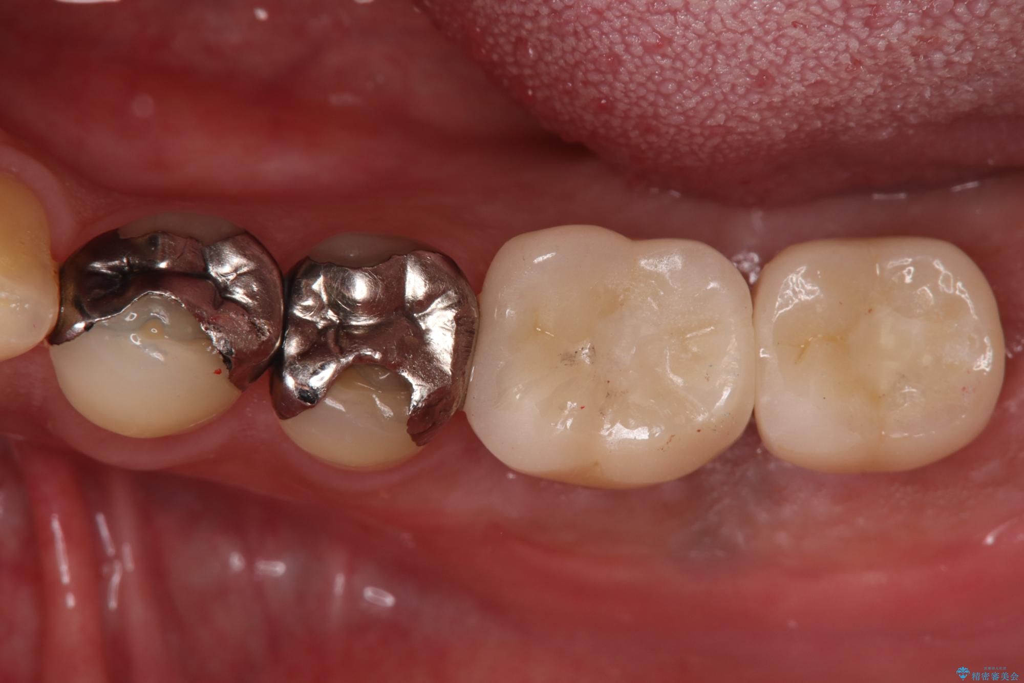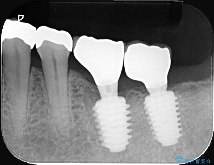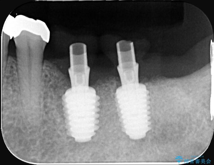 今回の治療では、まず左下6番と7番の欠損部に、骨の状態を考慮しながら慎重に2本のインプラントを埋入しました。インプラント体と骨がしっかりと結合するのを待った後、最短の期間で最終的な被せ物を装着するための精密な型取りを実施。最終的に、周囲の歯と調和した審美性の高いセラミック製の歯を装着しました。