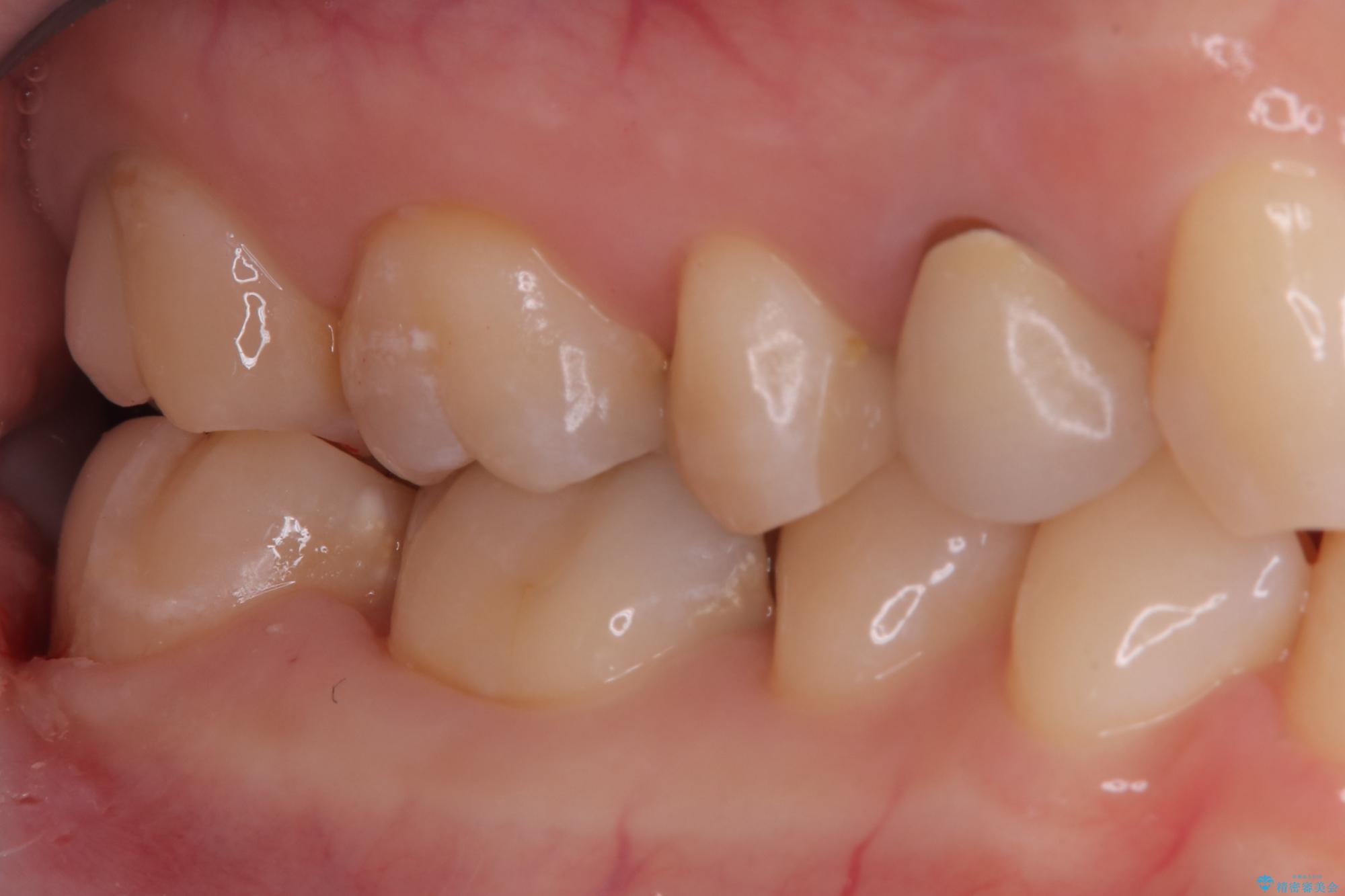 治療では、まず古い金属のインレーを慎重に取り外し、内部に虫歯の再発がないかを丁寧に確認しました。歯を最小限だけ形成した後、精密な型取りから患者様の歯の色に合わせたオーダーメイドのセラミックインレーを作製しました。セラミックは、歯質との適合性が高く、プラークが付着しにくいため、虫歯の再発リスクを抑えるメリットもあります。適合性の高いセラミックインレーを装着することで、長年のコンプレックスだった銀歯がなくなり、機能的にも安定した自然な奥歯を取り戻していただけました。