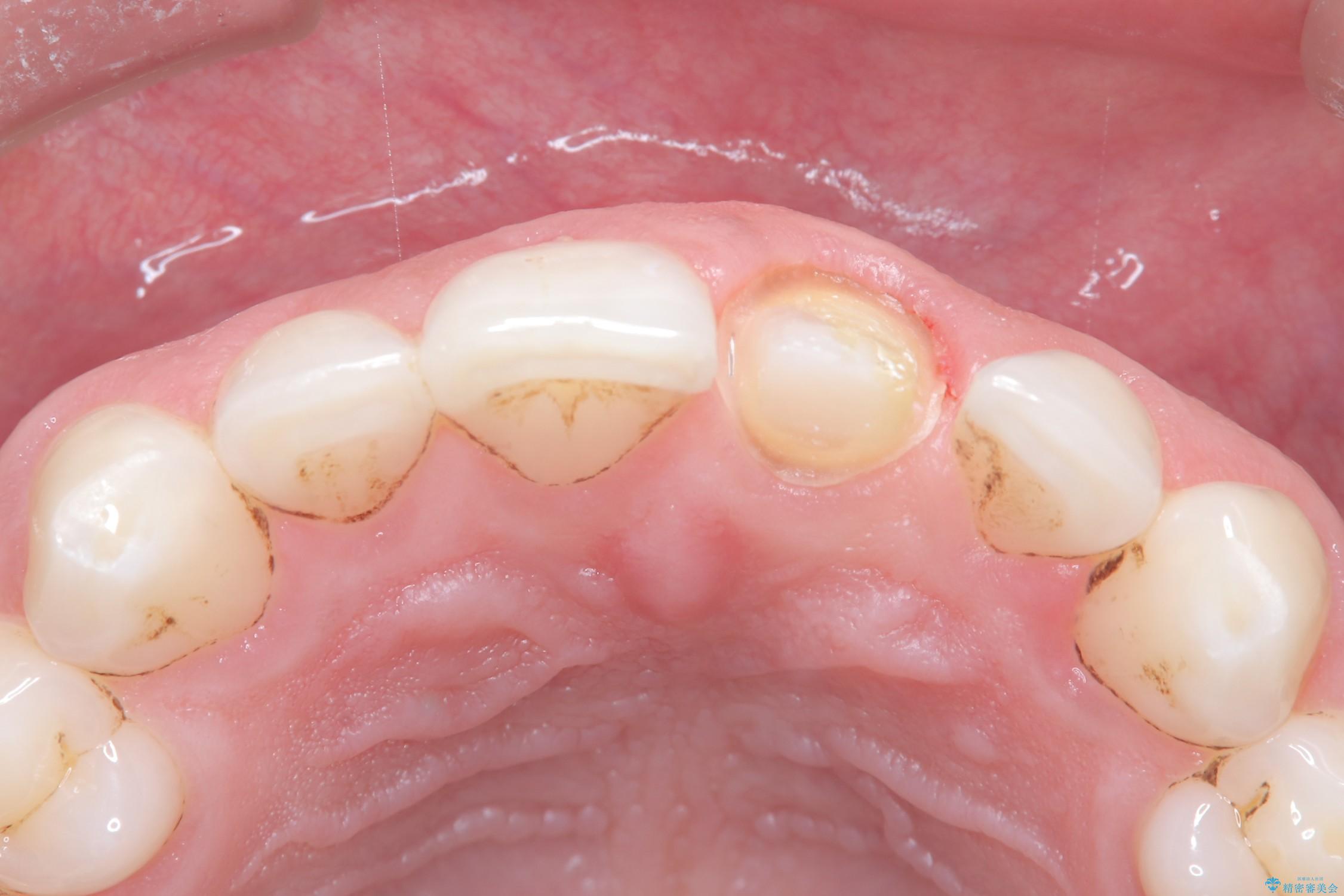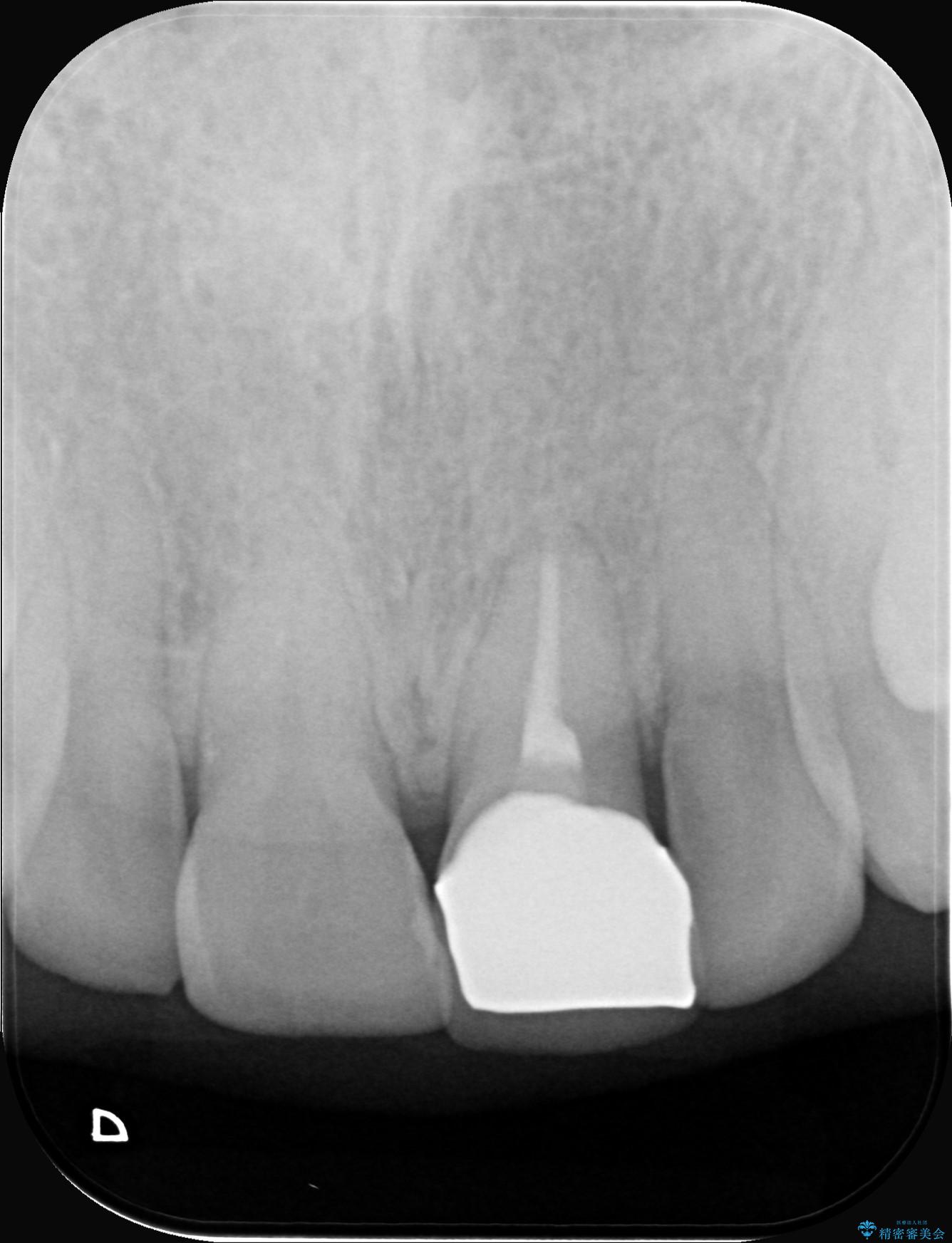 過去に神経の治療をした歯に変色がみられました。ラバーダム防湿の重要性を説明し、予防的に再根管治療から行い、被せ物をすることとなりました。