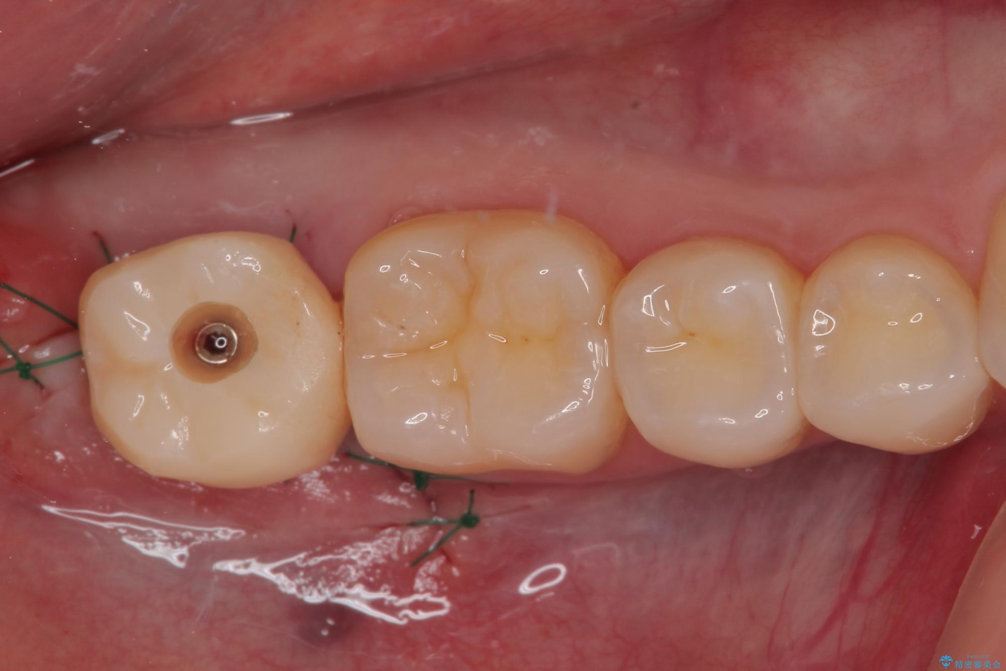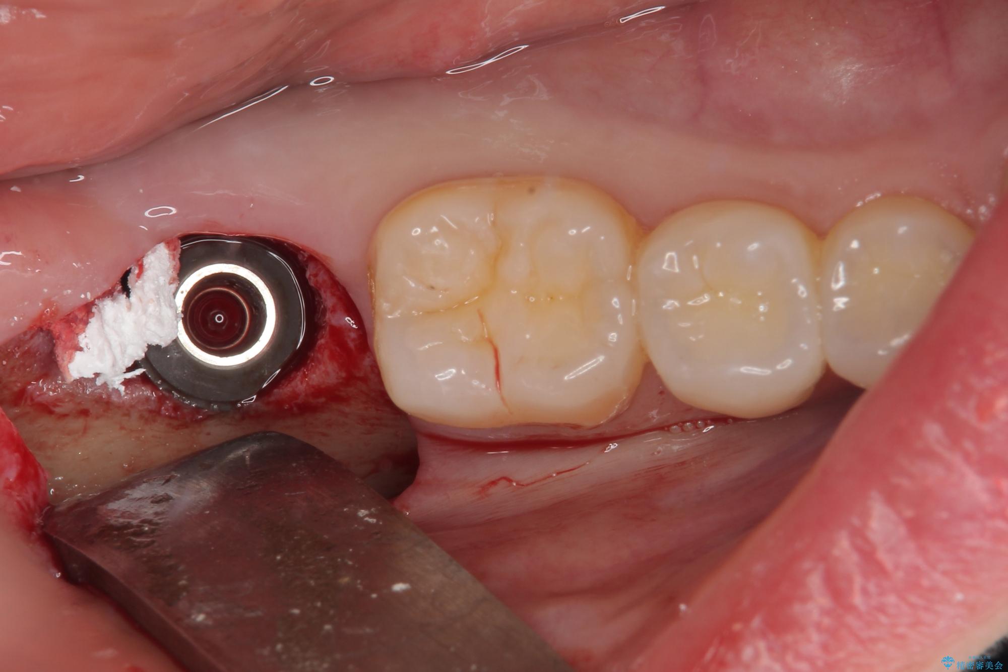 抜歯された骨の穴は、インプラント埋入時にはまだ大きな窩洞となっていましたが、径の大きいワイドインプラントを選択することで、埋入時に十分な安定を獲得することができました。