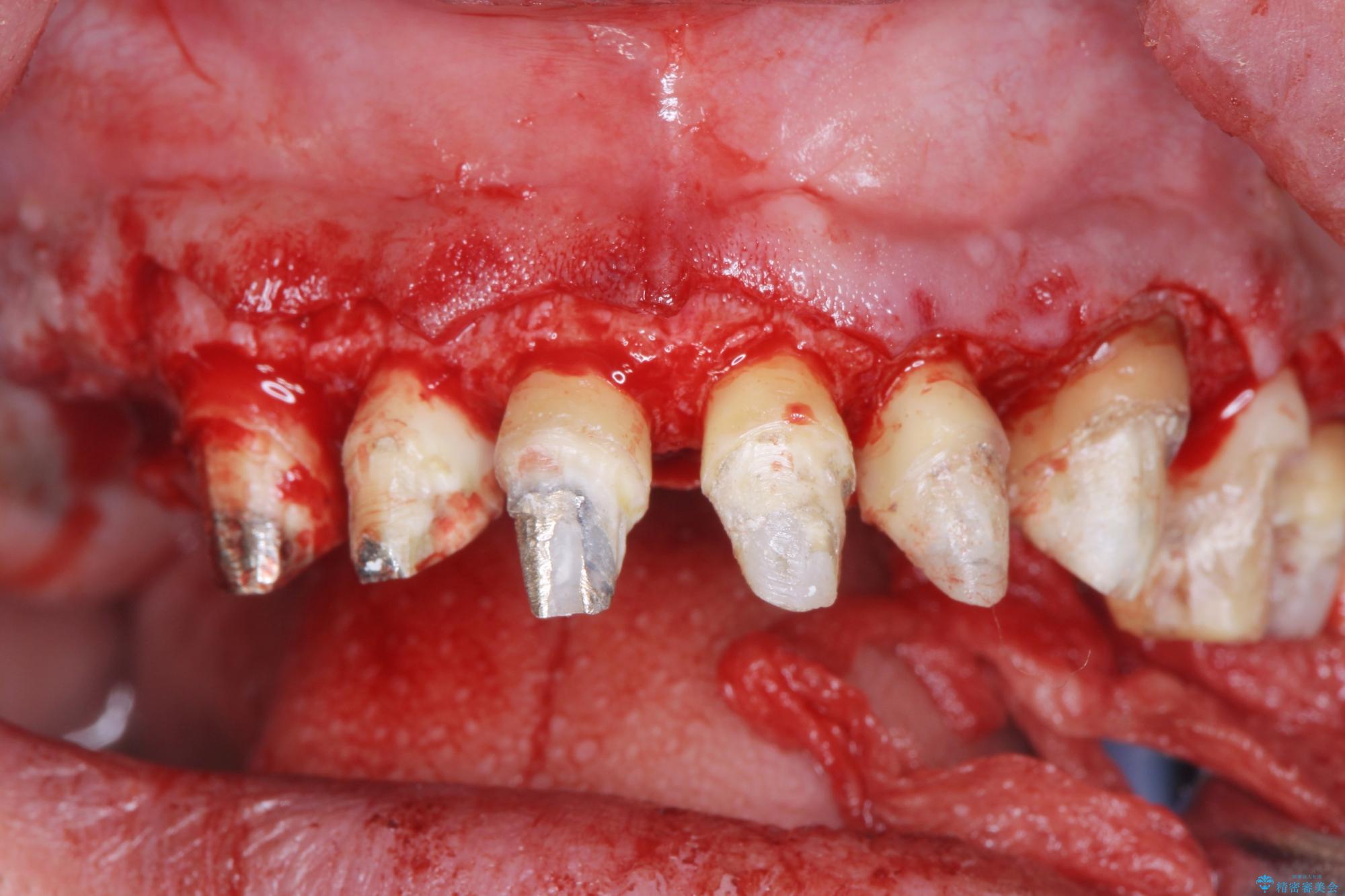 セラミッククラウンを除去し仮歯を装着し、歯周外科手術を行い歯ぐきの状態を改善したのち、適合の良いセラミッククラウンを再作製をする治療計画としました。
